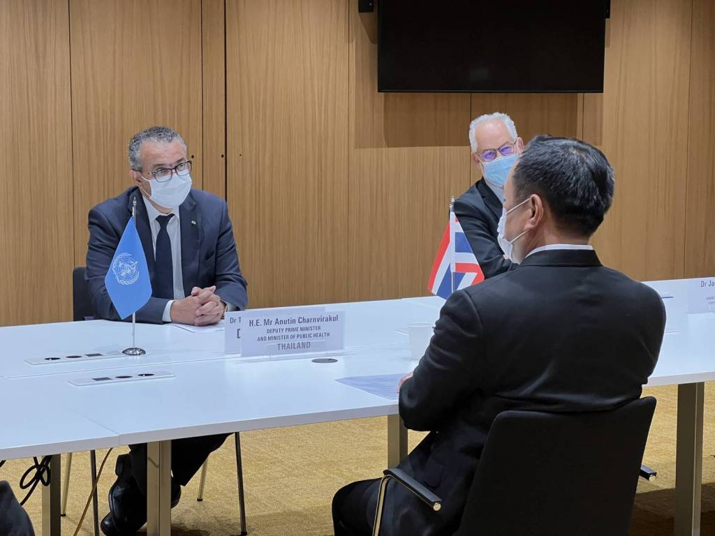ล่าสุด นายอนุทิน ได้เข้าพบนาย เทดรอส อัดฮานอม เกเบรเยซุส ผู้อำนวยการใหญ่องค์การอนามัยโลก (WHO) ถึงแนวทางการควบคุมโควิด 19 ซึ่งมีความเห็นสอดคล้องว่าการให้บริการวัคซีน อย่างทั่วถึง และเท่าเทียม มีความจำเป็นอย่างยิ่ง และขอให้ประเทศสมาชิกเครือข่ายเร่งฉีดวัคซีนให้กับพลเมือง สำหรับประเทศไทยให้บริการวัคซีน บนพื้นฐานการตระหนักถึงความจำเป็นในการฉีดวัคซีนที่มีคุณภาพแก่ประชาชนอย่างครอบคลุม โดยประเทศไทย ฉีดวัคซีนแก่ประชาชนเกินกว่า 60% ของประชากรแล้ว บรรลุแผนการเบื้องต้น ขณะที่คนไทยกว่า 70% ได้รับวัคซีน สอดคล้องกับเป้าหมาย WHO ที่ทั่วโลกต้องได้วัคซีน 70% ของประชากร การให้บริการวัคซีนของเรา เป็นไปด้วยอัตราที่น่าพอใจ แต่ที่น่ากังวลคือภาพรวมการเข้าถึงวัคซีนจากทั่วโลก ผอ.องค์การอนามัยโลก เปิดเผยว่า ประเทศยากจนจำนวนมาก ยังขาดแคลนวัคซีน ซึ่งตราบใดที่การให้บริการวัคซีนไม่ทั่วถึง โลกก็ยังไม่ปลอดภัย สำหรับประเทศไทย เข้าใจสถานการณ์ และพร้อมบริจาควัคซีนแก่ชาติอื่น เมื่อเรามั่นใจในจำนวนวัคซีนที่สำรองไว้ ไปจนถึงจำนวนผู้ที่ได้รับวัคซีน ต้องอยู่ในจุดที่มากพอ