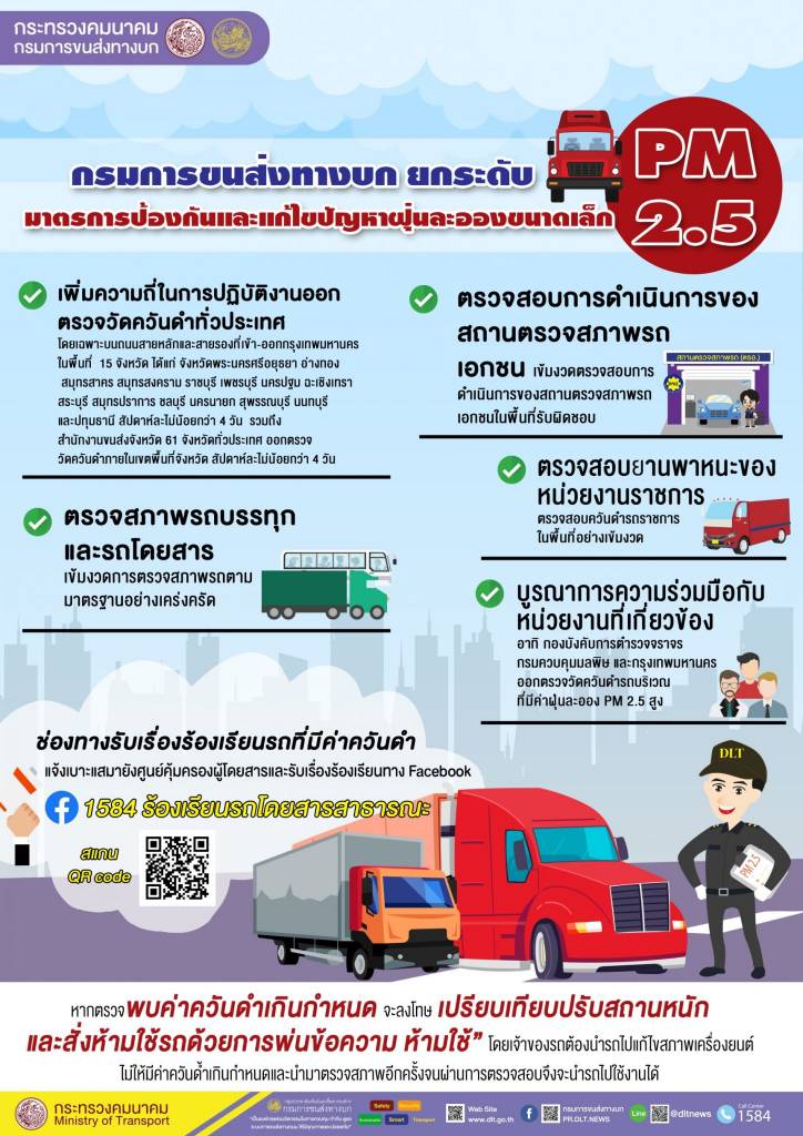 กรมการขนส่งทางบก ยกระดับมาตรการป้องกันและแก้ไขปัญหาฝุ่นละอองขนาดเล็ก PM 2.5 จากภาคการขนส่งอย่างเข้มข้นต่อเนื่องทุกมาตรการ ตั้งแต่ช่วงปลายปี 2564 ต่อเนื่องไปถึงต้นปี 2565