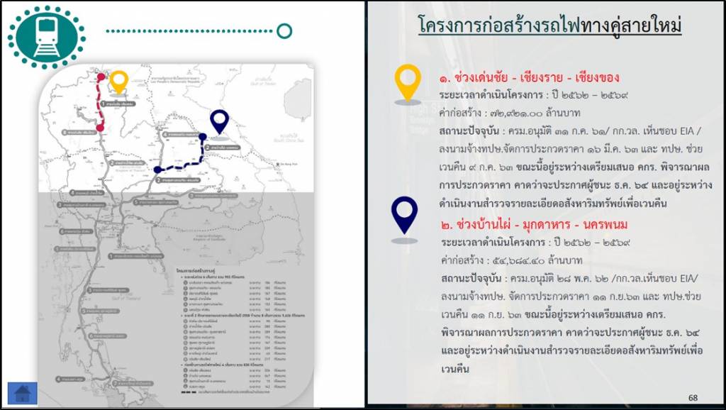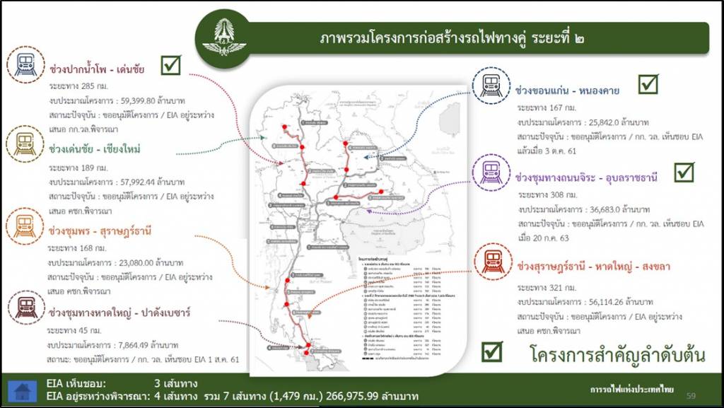 3. ให้ รฟท. เร่งรัดการนำเสนอโครงการก่อสร้างรถไฟทางคู่ ระยะที่ 2 ช่วงขอนแก่น-หนองคาย เพื่อเชื่อมโยงโครงข่ายรถไฟทางคู่ภาคตะวันออกเฉียงเหนือตอนบน ให้มีความสมบูรณ์ และสามารถเชื่อมต่อระบบโลจิสติกส์กับ สปป. ลาว ได้อย่างมีประสิทธิภาพ