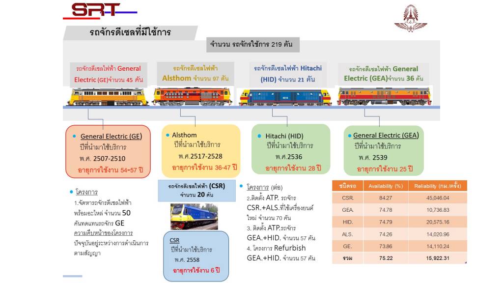 ว่าปัจจุบันมีรถจักรดีเซลไฟฟ้า ซึ่งอยู่ในสภาพพร้อมใช้งานจำนวน 219 คัน แบ่งเป็นรถจักรดีเซลไฟฟ้า (CSR) รุ่นใหม่ น้ำหนักกดลงเพลา 20 ตัน/เพลา จำนวน 20 คัน ใช้สำหรับขนส่งสินค้า ส่วนรถจักรที่มีน้ำหนักกดลงเพลา 15-16 ตัน/เพลา ได้แก่ รถจักรดีเซลไฟฟ้า (GEA) จำนวน 36 คัน รถจักรดีเซลไฟฟ้า (Hitachi)