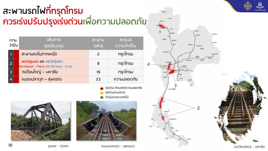 16 ตัน/เพลา และมีสะพานรถไฟซึ่งถึงกำหนดต้องบำรุงรักษาตามระยะเวลา เช่น สะพานหอในสายเหนือ 2 แห่งที่จังหวัดลำปาง สะพานรถไฟสายใต้ที่จังหวัดชุมพร จังหวัดสุราษฎร์ธานี และจังหวัดนครศรีธรรมราช จำนวน 8 แห่ง สะพานรถไฟช่วงวงเวียนใหญ่ - มหาชัย จำนวน 19 แห่ง และสะพานรถไฟช่วงหนองปลาดุก - สุพรรณบุรี จำนวน 23 แห่ง