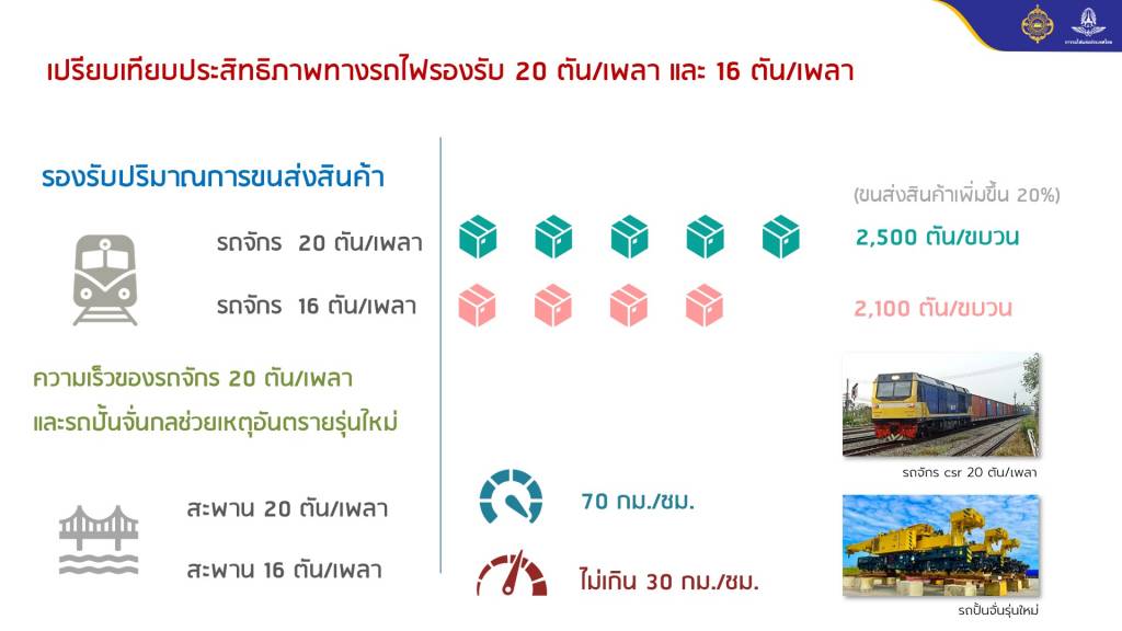 นายศักดิ์สยามฯ กล่าวว่า ปัจจุบันเส้นทางรถไฟซึ่งอยู่ในความรับผิดชอบของการรถไฟแห่งประเทศไทย ได้มีการก่อสร้างปรับปรุงทางรถไฟให้สามารถรองรับรถจักรบรรทุกสินค้าขนาด 20 ตัน/เพลาแล้ว เช่น เส้นทางสายตะวันออกเฉียงเหนือ (กรุงเทพฯ - หนองคาย) สายตะวันออก (กรุงเทพฯ - ระยอง) และสายเหนือ (กรุงเทพฯ - เชียงใหม่) อย่างไรก็ตาม ยังมีสะพานรถไฟในบางสายทางยังไม่ได้รับการปรับปรุงให้รองรับน้ำหนักกดลงเพลา 20 ตัน/เพลา โดยเฉพาะในเส้นทางสายใต้ ซึ่งสะพานรถไฟส่วนใหญ่รองรับน้ำหนักบรรทุกได้เพียง