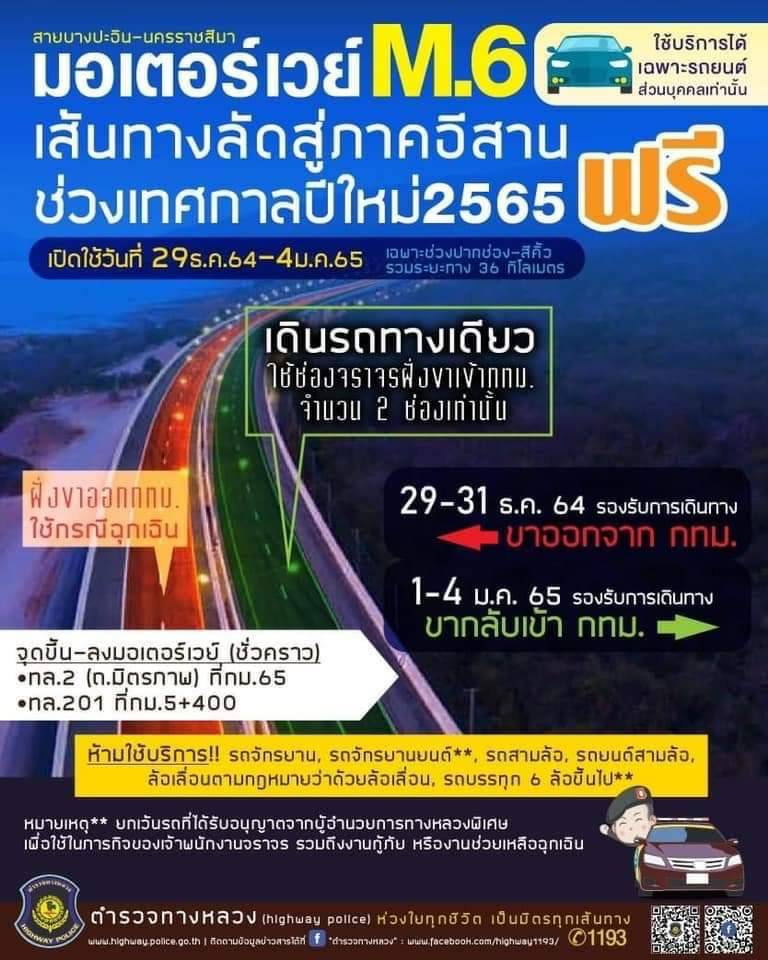 การเตรียมเปิดให้ประชาชนใช้บริการฟรีบางช่วงระยะทางของทางหลวงพิเศษระหว่างเมือง สายบางปะอิน-นครราชสีมา (M6) ในเส้นทางช่วงปากช่อง - สีคิ้ว ระยะทาง 35.75 กิโลเมตร เพื่อบรรเทาการจราจรติดขัดในเส้นทางสายตะวันออกเฉียงเหนือช่วงเทศกาลปีใหม่ พ.ศ. 2565 เส้นทางให้บริการเริ่มต้นจากถนนมิตรภาพ (ทางหลวงหมายเลข 2) บริเวณ กม.65 (M6 บริเวณพื้นที่ตอน 24) สิ้นสุดถึงทางหลวงหมายเลข 201 บริเวณ กม. 5+400 (M6 บริเวณพื้นที่ตอน 37) มีกำหนดเปิดให้บริการเฉพาะรถยนต์เท่านั้น ระหว่างเวลา 06.00 น. - 21.00 น. รองรับทิศทางขาออกกรุงเทพฯ 3 วัน ระหว่างวันที่ 29 - 31 ธันวาคม 2564 และรองรับทิศทางขาเข้ากรุงเทพฯ 4 วัน ระหว่างวันที่ 1 - 4 มกราคม 2565