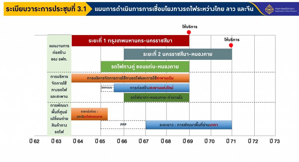 โดยหน่วยงานที่เกี่ยวข้องจากกระทรวงคมนาคม นำโดยนายศักดิ์สยาม ชิดชอบ รัฐมนตรีว่าการกระทรวงคมนาคม กระทรวงการคลัง กระทรวงการต่างประเทศ กระทรวงเกษตรและสหกรณ์ กระทรวงพาณิชย์ กระทรวงอุตสาหกรรม พร้อมด้วยสภาพัฒนาการเศรษฐกิจและสังคมแห่งชาติ ได้ร่วมหารือเพื่อพิจารณาแผนการดำเนินการเชื่อมโยงทางรถไฟระหว่างไทย ลาว และจีน และได้เห็นชอบแผนการดำเนินงาน และเห็นชอบให้แต่งตั้นคณะอนุกรรมการเพื่อติดตามความก้าวหน้าสถานะการดำเนินงานของหน่วยงานที่เกี่ยวข้อง และเห็นชอบการจัดทำ Framework Agreement การขนส่งทางรถไฟระหว่างไทย ลาว และจีน โดยการเชื่อมต่อการเดินทางข้ามแดนผ่านทางรถไฟช่วงหนองคาย – เวียงจันทน์ ซึ่งในการเจรจาระหว่างประเทศนั้น ให้ดำเนินการเจรจาบนพื้นฐานที่ไทย ลาว และจีนมีความเกี่ยวข้องและผลประโยชน์ร่วมกัน โดยอาจยกระดับให้เป็นบันทึกข้อตกลงที่มีความผูกพันเพิ่มเติม