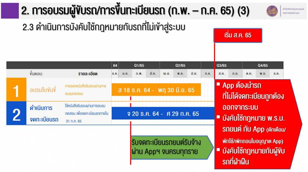อธิบดีกรมการขนส่งทางบก กล่าวต่อไปว่า หลังจากที่มีแอปพลิเคชันที่ถูกต้องตามกฎหมายออกให้บริการเป็นทางเลือกให้กับประชาชนแล้ว กระทรวงคมนาคมมีนโยบายในการดำเนินการบังคับใช้กฎหมายอย่างเคร่งครัดกับผู้ให้บริการระบบแอปพลิเคชันที่ไม่มาดำเนินการขอรับรองตามที่กฎหมาย โดยกำหนดแอปพลิเคชันที่ให้บริการในปัจจุบันต้องยื่นขอรับรองให้แล้วเสร็จภายในเดือนมีนาคม 2565 และกรมการขนส่งทางบกจะประสานกับกระทรวงดิจิทัลเพื่อเศรษฐกิจและสังคม หรือหน่วยงานที่เกี่ยวข้อง เพื่อดำเนินการปิดกั้นหรือระงับการเข้าถึงการให้บริการแอปพลิเคชันที่ไม่ยื่นขอรับรอง รวมทั้งบังคับใช้กฎหมายกับผู้ขับรถที่ให้บริการผ่านแอปพลิเคชันที่ไม่ได้รับการรับรองอย่างเคร่งครัดต่อไป สำหรับแอปพลิเคชันที่ผ่านการรับรองตามกฎหมายแล้ว จะต้องเร่งนำรถที่อยู่ในระบบมาดำเนินการจดทะเบียนเป็นรถยนต์รับจ้างผ่านระบบอิเล็กทรอนิกส์ซึ่งกำหนดให้จดทะเบียนได้เพียง 1 คันต่อคน มีอายุการใช้งานไม่เกิน 9 ปี ทำประกันภัยรถยนต์สาธารณะเพิ่มเติม ผู้ขับรถจะต้องมีใบอนุญาตขับรถยนต์สาธารณะ และรถที่ขึ้นทะเบียนแล้วต้องติดเครื่องหมายแสดงการเป็นรถยนต์รับจ้างทางเลือกอย่างชัดเจน บริเวณกระจกกันลมหน้าและกระจกกันลมด้านหลัง เพื่อแสดงให้ผู้โดยสารเห็นว่ารถคันที่ให้บริการได้ขึ้นทะเบียนถูกต้องตามกฎหมายแล้ว โดยจะต้องดำเนินการจดทะเบียนรถให้เรียบร้อยภายในเดือนกรกฎาคม 2565 ทั้งนี้ เพื่อให้มีจำนวนรถยนต์รับจ้างผ่านระบบอิเล็กทรอนิกส์ที่ถูกต้องตามกฎหมายเพียงพอต่อความต้องการใช้บริการของประชาชน กรมการขนส่งทางบกได้เตรียมการเปิดอบรมใบอนุญาตขับรถสาธารณะเป็นการเพิ่มเติม เพื่อรองรับปริมาณผู้ขับรถที่ประสงค์จะขึ้นทะเบียนเป็นรถยนต์รับจ้างผ่านระบบอิเล็กทรอนิกส์ที่ถูกต้องตามกฎหมาย หลังจากนั้น กรมการขนส่งทางบกจะดำเนินการบังคับใช้กฎหมายกับผู้ให้บริการระบบแอปพลิเคชันที่ยังคงใช้รถยนต์ที่ไม่ถูกต้องและผู้ขับรถที่มาให้บริการร่วมในระบบ ทั้งนี้ เพื่อให้การให้บริการรถยนต์รับจ้างผ่านระบบอิเล็กทรอนิกส์เป็นไปด้วยความเรียบร้อยและเป็นธรรมต่อทุกฝ่าย อธิบดีกรมการขนส่งทางบก กล่าวในที่สุด