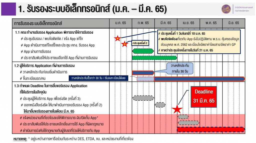 กรมการขนส่งทางบก เผย!!! มีผู้ให้บริการแอปพลิเคชันยื่นขอรับรองแล้ว 3 รายเร่งรัด!!! ให้แอปพลิเคชันที่บริการอยู่จะต้องยื่นขอรับรองตามกฎหมายภายใน มี.ค. 65 และต้องจดทะเบียนรถให้แล้วเสร็จภายใน ก.ค. 65 ย้ำ!! ผู้ให้บริการทุกรายต้องดำเนินการให้ถูกต้องตามหลักเกณฑ์ เพื่อให้ประชาชนได้รับบริการที่มีคุณภาพและปลอดภัย