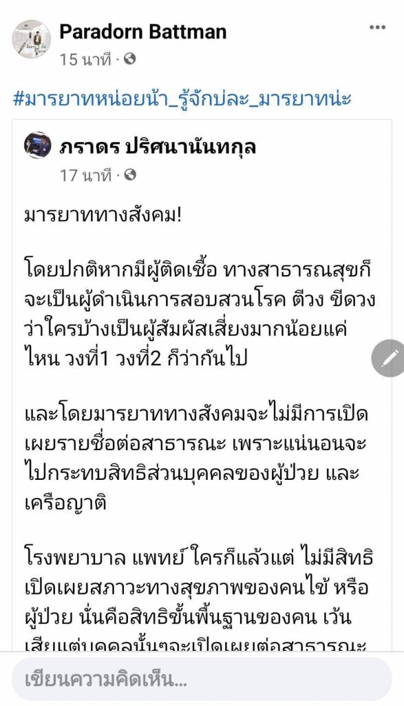 นายภราดร ปริศนานันทกุล โฆษกพรรคภูมิใจไทย โพสต์เฟซบุ๊กส่วนตัว Paradorn Battman โดยถามหามารยาทในการนำชื่อบุคคล ที่ติดเชื้อโควิด-19 ไปเผยแพร่ทั้งที่ไม่ใช่บุคลากรทางการแพทย์ และไม่มีหน้าที่เกี่ยวข้อง โดยระบุว่า