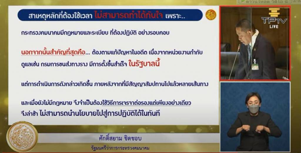 ทั้งนี้ รัฐมนตรีว่าการกระทรวงคมนาคม ชี้แจงประเด็นที่สมาชิกสภาผู้แทนราษฎร ได้อภิปรายเสนอแนะ โดยแบ่งออกเป็นประเด็น ดังนี้