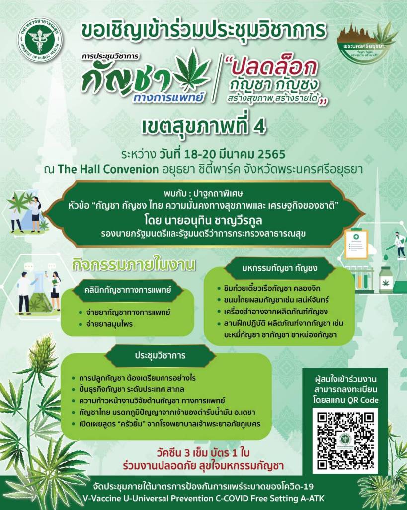 เตรียมท้องให้พร้อม !!! “อนุทิน” เป็นประธานเปิดงาน “ปลดล็อก กัญชา กัญชง สร้างสุขภาพ สร้างรายได้” เขตสุขภาพที่ 4 จ.พระนครศรีอยุธยา ที่จะจัดขึ้นอย่างยิ่งใหญ่ วันที่ 19 มีนาคม 2565 ที่ “อยุธยา ซิตี้พาร์ค” พบกับ ก๋วยเตี๋ยวเรือกัญชา คลองจิก – ขนมไทยผสมกัญชา (ขนมเสน่ห์จันทร์) - เครื่องสำอางกัญชง สอนทำบะหมี่กัญชา ชากัญชา พร้อมคลินิกกัญชาทางการแพทย์ และงานประชุมวิชาการ