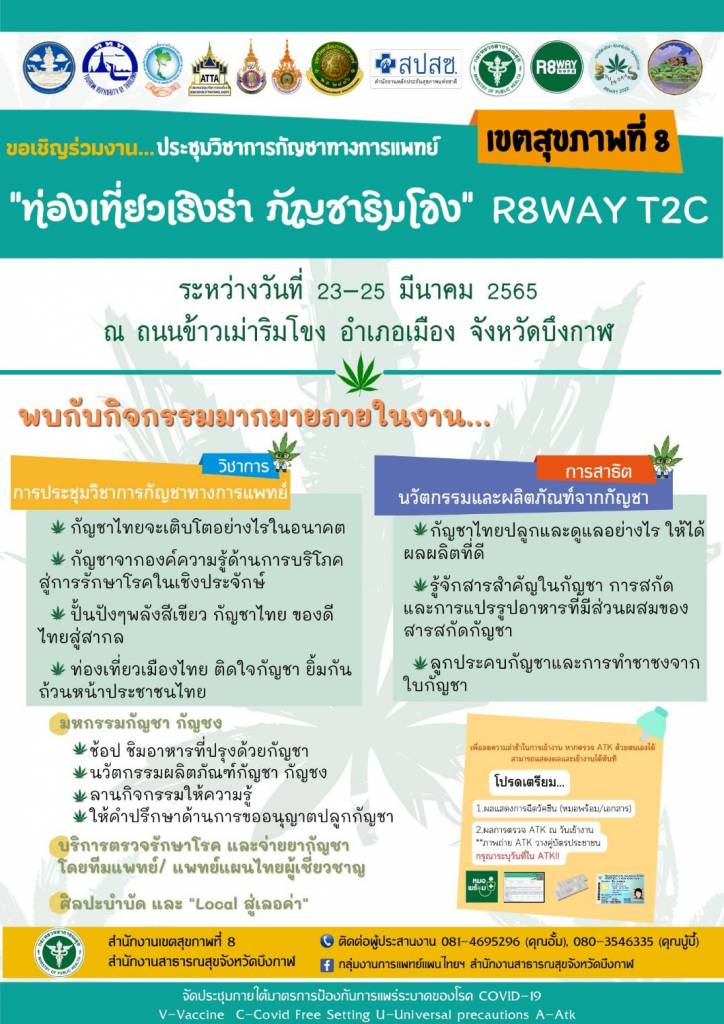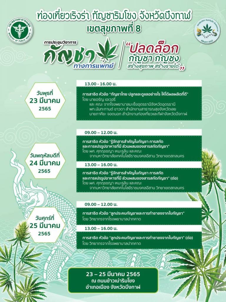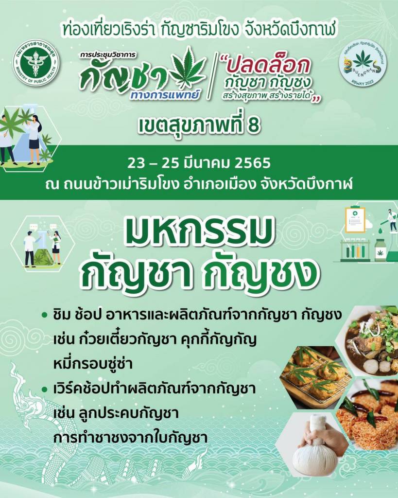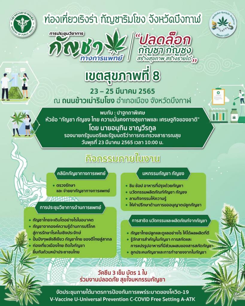 นพ.ภูวเดช สุระโคตร ผู้ช่วยปลัดกระทรวงสาธารณสุข เปิดเผยว่า ในวันที่ 23 มีนาคม 2565 นายอนุทิน ชาญวีรกูล รองนายกรัฐมนตรี และรมว.สาธารณสุข จะเป็นประธานเปิดงาน ประชุมวิชาการกัญชาทางการแพทย์ ปลดล็อกกัญชา กัญชง สร้างสุขภาพ สร้างรายได้ ที่จังหวัดบึงกาฬ เพื่อให้ประชาชนได้เรียนรู้ทั้งทางวิชาการ การฝึกปฏิบัติจริง และการได้พบกับผลิตภัณฑ์ที่เกี่ยวข้องกับ กัญชา กัญชง โดยเขตสุขภาพที่ 8 จัดงานที่จังหวัดบึงกาฬ ระหว่างวันที่ 23-25 มีนาคม จัดงานครั้งนี้ภายใต้แนวคิดที่ว่า “ท่องเที่ยวกัญชา เริงร่าริมโขง” เพราะว่าเป็นที่มีทั้งกัญชา ที่ว่าเป็นแหล่งที่ดีที่สุด และเป็นแหล่งท่องเที่ยวริมแม่น้ำโขง เป็นศูนย์กลางกัญชาโลก เลยนำ 2 อย่างมาบูรณาการกัน การจัดงานครั้งนี้ ตรงกับวันจัดตั้งจังหวัดบึงกาฬ คือ วันที่ 23 มีนาคม