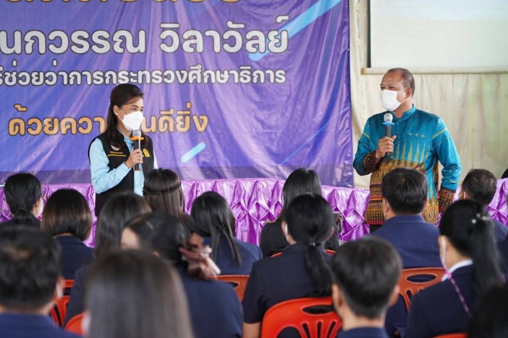 รมช.ศึกษาธิการ กล่าวตอนหนึ่งว่า ในวันนี้ครูโอ๊ะรู้สึกเป็นเกียรติและดีใจเป็นอย่างยิ่งที่ได้มาตรวจเยี่ยมและติดตามผลการดำเนินงานโครงการ “พาน้องกลับมาเรียน” และ กศน.ปักหมุด เพื่อสร้างโอกาสทางการศึกษาสำหรับคนพิการและผู้ด้อยโอกาส ของจังหวัดบึงกาฬ ทั้งยังได้รับรายงานสรุปสถิติการดำเนินโครงการ “พาน้องกลับมาเรียน” ซึ่งสามารถค้นหา นักเรียน นักศึกษา จากทุกสังกัดได้จำนวน 350 คน จำแนกเป็น สพฐ. 171 คน สำนักงานคณะกรรมการการอาชีวศึกษา (สอศ.) 131คน สำนักงานคณะกรรมการส่งเสริมการศึกษาเอกชน (สช.) 21 คน และสำนักงานส่งเสริมการศึกษานอกระบบและการศึกษาตามอัธยาศัย (กศน.) 27 คน ทั้งนี้เมื่อจำแนกสาเหตุการหลุดออกจากระบบ จะพบว่าเกิดจากหลากหลายมิติ เช่น การคมนาคมไม่สะดวก สุขอนามัย ความพิการ ความจำเป็นทางครอบครัว สภาพของครอบครัว จบการศึกษาภาคบังคับและไม่ประสงค์จะเข้าเรียนต่อ ได้รับผลกระทบจากสถานการณ์การแพร่ระบาดของโรคโควิด-19 อายุพ้นเกณฑ์และไม่เรียนต่อ เข้าเรียนในสถานศึกษาสังกัดอื่น เรียนต่อต่างประเทศ เสียชีวิต เป็นต้นซึ่งถือเป็นขอมูลที่เป็นประโยชน์เป็นอย่างยิ่ง