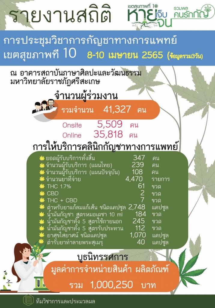 สำหรับสถิติ จำนวนผู้เข้าร่วมงาน ทั้งสิ้น 41,327 คน แยกเป็น on site 5,509 คน Online 35,818 คน การให้บริการคลินิกกัญชาทางการแพทย์ ยอดผู้รับบริการทั้งสิ้น 347 คน จ่ายน้ำมันกัญชา 4,470 รายการ บูธนิทรรศการ มีมูลค่าการจำหน่ายสินค้า ผลิตภัณฑ์ รวมทั้งสิ้น 1,000,250 บาท