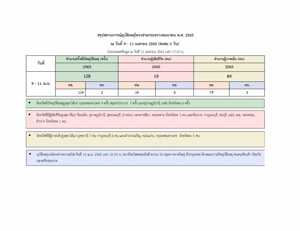 ศปภ.คค. รายงานสถิติดอุบัติเหตุบนโครงข่ายถนน วันที่ 11 เม.ย. 2565 ประมวลผลข้อมูล วันที่ 12 เม.ย. 2565