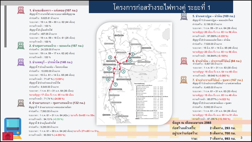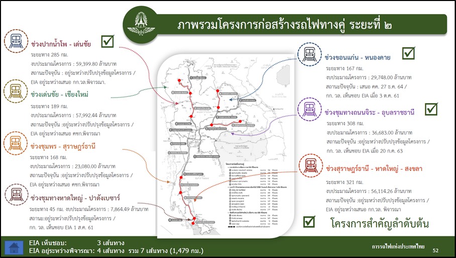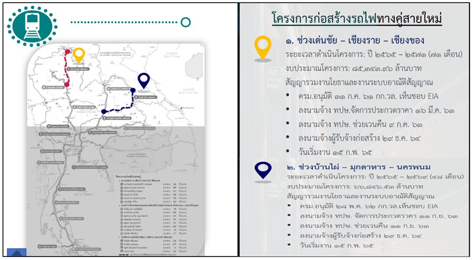 2.1 การรถไฟแห่งประเทศไทยได้เสนอโครงการก่อสร้างรถไฟทางคู่ระยะที่ 2 ในช่วงขอนแก่น – หนองคาย ซึ่งคณะกรรมการ รฟท. ได้ให้ความเห็นชอบแล้ว เมื่อวันที่ 27 ธันวาคม 2564 โดยกระทรวงคมนาคมได้เสนอเรื่องดังกล่าวต่อหน่วยงานเพื่อขอความเห็นประกอบการเสนอเรื่องให้คณะรัฐมนตรีพิจารณาปัจจุบันการรถไฟแห่งประเทศไทยอยู่ระหว่างการดำเนินการจัดทำข้อมูลเพิ่มเติมประกอบการพิจารณาของหน่วยงาน