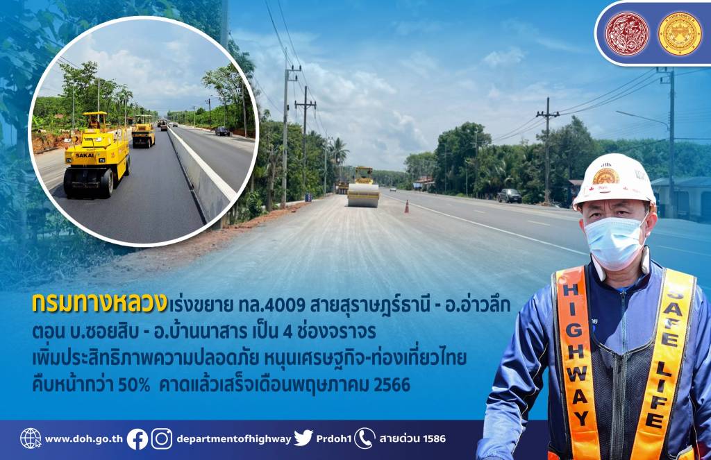 กรมทางหลวง โดยสำนักก่อสร้างทางที่ 1 ขานรับนโยบายดังกล่าวเร่งดำเนินโครงการก่อสร้างทางหลวงหมายเลข 4009 สาย สุราษฎร์ธานี - อ.อ่าวลึก ระหว่าง กม.18+000 – กม.41+000 ระยะทางรวม 23 กิโลเมตร โดยจุดเริ่มต้นโครงการอยู่ในพื้นที่ โรงเรียนบ้านซอยสิบ ต.ขุนทะเล อ.เมืองสุราษฎร์ธานี สิ้นสุดที่ อ.นาสาร จ.สุราษฎร์ธานี โดยขยายจาก 2 ช่องจราจรเป็นมาตรฐานทางชั้นพิเศษขนาด 4 ช่องจราจร (ไปกลับข้างละ 2 ช่องจราจร) ผิวทางเป็นแอสฟัลต์คอนกรีต ช่องจราจรกว้างช่องละ 3.50 เมตร ไหล่ทางชนิดเดียวกับผิวทางด้านนอกกว้าง 2.50 เมตร ด้านในกว้าง 0.70 เมตร และก่อสร้างบริเวณทางแยกผิวทางเป็น Concrete Pavement หนา 25 เซนติเมตร ผิวจราจรกว้างช่องละ 3.50 เมตร มีเกาะกลางแบบยก (Raised Median) และแบ่งช่องจราจรด้วยแบริเออร์คอนกรีตแบบฐานแผ่สองด้าน (Barrier Type II) รวมงานก่อสร้างสะพานคอนกรีตข้ามคลอง 6 แห่ง และก่อสร้างศาลาทางหลวงในบริเวณสองข้างทางเพื่ออำนวยความสะดวกให้กับประชาชนจำนวน 21 แห่ง พร้อมติดตั้งไฟฟ้าแสงสว่างตลอดสายรวมทั้งอุปกรณ์อำนวยความปลอดภัยต่าง ๆ ตามมาตรฐานกรมทางหลวง งบประมาณโครงการ 1,113.164 ล้านบาท ปัจจุบันการก่อสร้างคืบหน้ากว่า 50 % คาดว่าก่อสร้างแล้วเสร็จประมาณเดือน พฤษภาคม ปี 2566