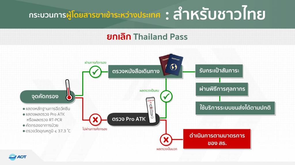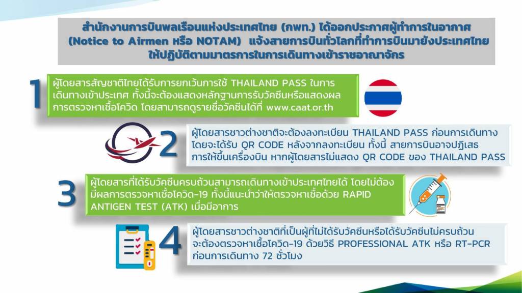 1. ผู้โดยสารสัญชาติไทยได้รับการยกเว้นการใช้ Thailand Pass ในการเดินทางเข้าประเทศ ทั้งนี้ จะต้องแสดงหลักฐานการรับวัคซีนหรือแสดงผลการตรวจหาเชื้อโควิด โดยสามารถดูรายชื่อวัคซีนได้ที่ www.caat.or.th