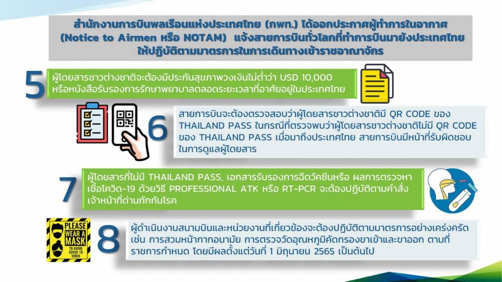 8. ผู้ดำเนินงานสนามบินและหน่วยงานที่เกี่ยวข้องจะต้องปฏิบัติตามมาตรการอย่างเคร่งครัด เช่น การสวมหน้ากากอนามัย การตรวจวัดอุณหภูมิคัดกรองขาเข้าและขาออก ตามที่ราชการกำหนด โดยมีผลตั้งแต่วันที่ 1 มิถุนายน 2565 เป็นต้นไป