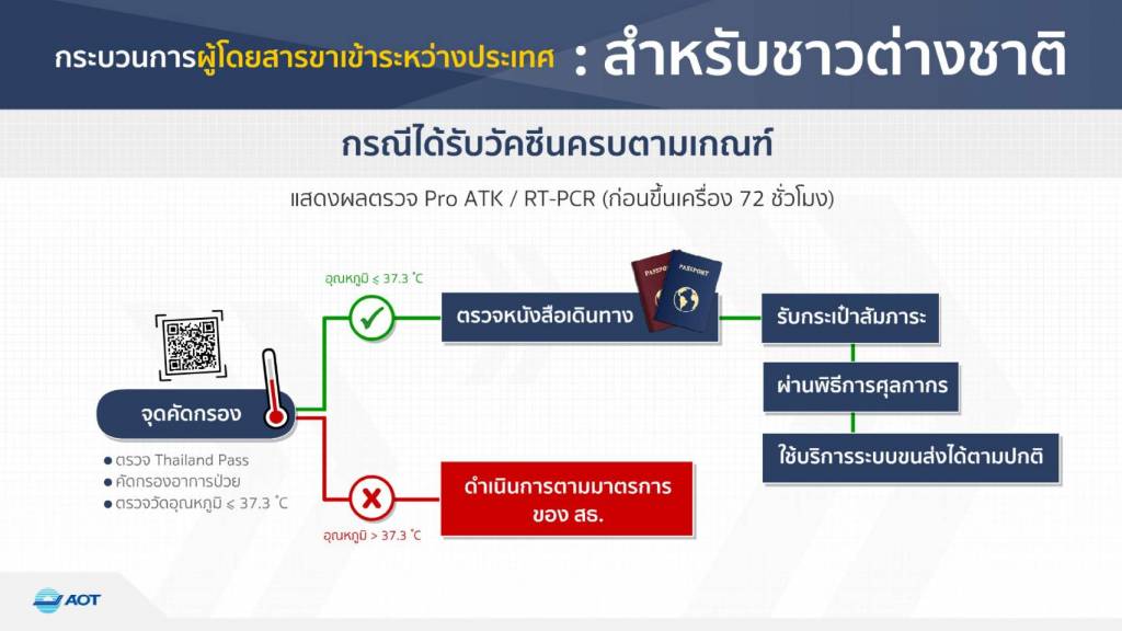 3. ผู้โดยสารที่ได้รับวัคซีนครบถ้วนสามารถเดินทางเข้าประเทศไทยได้ โดยไม่ต้องมีผลการตรวจหาเชื้อโควิด-19 ทั้งนี้ แนะนำว่าให้ตรวจหาเชื้อด้วย RAPID ANTIGEN TEST (ATK) เมื่อมีอาการ