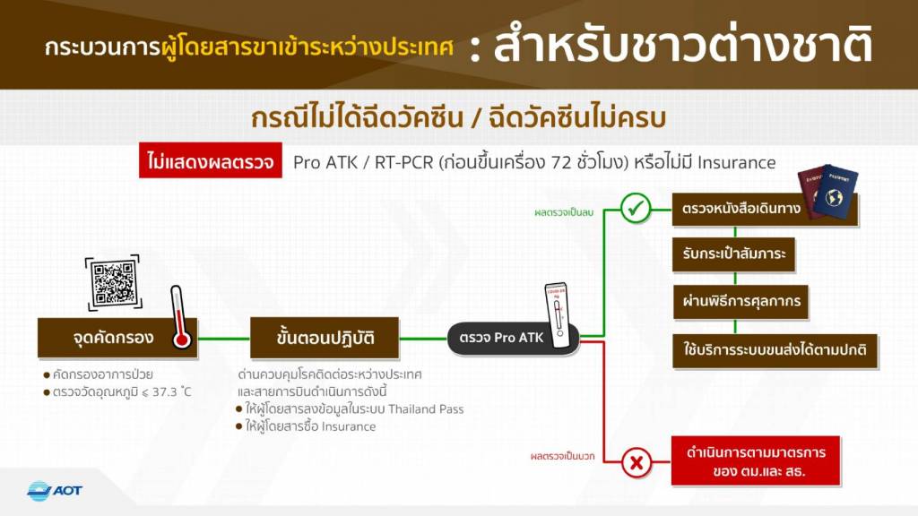 4. ผู้โดยสารชาวต่างชาติที่เป็นผู้ที่ไม่ได้รับวัคซีนหรือได้รับวัคซีนไม่ครบถ้วนจะต้องตรวจหาเชื้อโควิด-19 ด้วยวิธี PROFESSIONAL ATK หรือ RT-PCR ก่อนการเดินทาง 72 ชั่วโมง