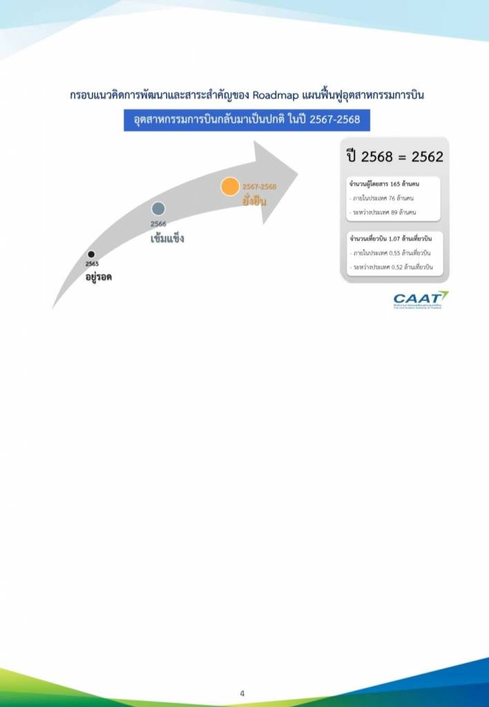 ว่า อุตสาหกรรมการบินจะฟื้นตัวกลับเข้าสู่สภาวะปกติภายใน 2-3 ปี ข้างหน้า ดังนั้น เพื่อเตรียมความพร้อมให้ผู้ประกอบการในอุตสาหกรรมและรองรับการฟื้นตัวที่จะเกิดขึ้น CAAT ตามมติ กบร. จึงได้ศึกษาและจัดทำ
