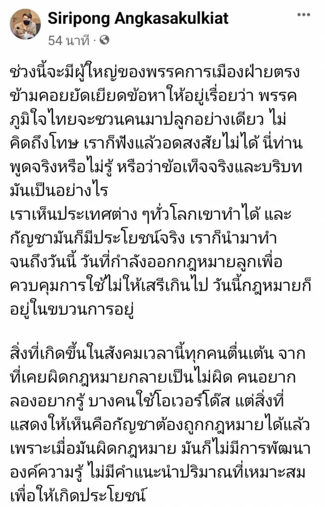 นายสิริพงศ์ อังคสกุลเกียรติ ส.ส.ศรีสะเกษ พรรคภูมิใจไทย โพสต์เฟซบุ๊กส่วนตัว ถึงกรณีที่นายภูมิธรรม เวชยชัย ที่ปรึกษาหัวหน้าพรรคเพื่อไทย กล่าวหาพรรคภูมิใจไทย ทำนโยบายกัญชา กัญชง ”เลอะเลือน” ดังนี้