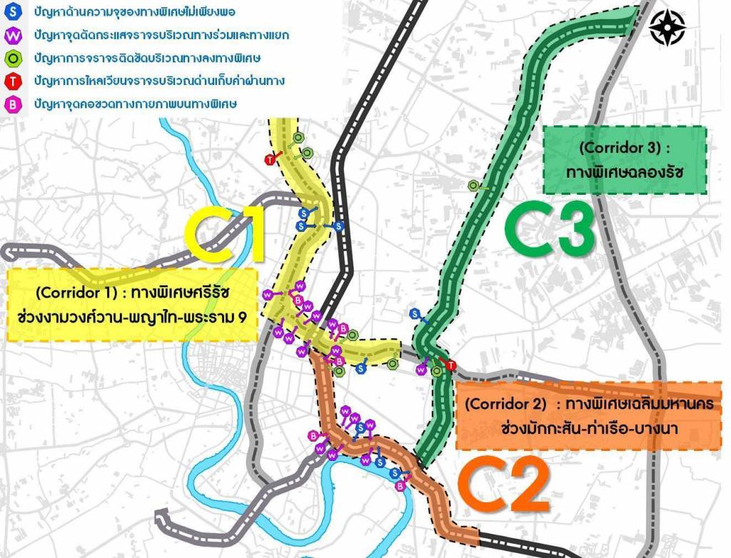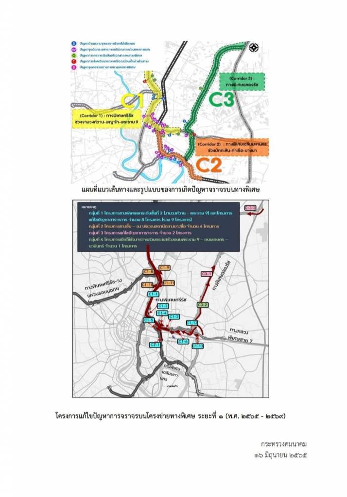 นายศักดิ์สยาม กล่าวว่า การทางพิเศษแห่งประเทศไทย (กทพ.) ได้รายงานความก้าวหน้าการศึกษาเพื่อแก้ไขปัญหาการจราจรบนโครงข่ายทางพิเศษ ซึ่งคณะกรรมการจัดระบบการจราจรทางบก (คจร.) ในคราวประชุมครั้งที่ 1/2565 เมื่อวันที่ 24 กุมภาพันธ์ 2565 ได้มีมติให้ความเห็นชอบรายงานผลการศึกษาการแก้ไขปัญหาการจราจรบนทางพิเศษในภาพรวมทั้งระบบไว้แล้ว และคณะรัฐมนตรีได้มีมติรับทราบผลการศึกษาของ กทพ. แล้ว เมื่อวันที่ 5 เมษายน 2565 รวมทั้ง กทพ. ได้มีการวิเคราะห์ความเหมาะสม และจัดลำดับความสำคัญ เพื่อจัดทำแผนการแก้ไขปัญหาการจราจรในภาพรวมทั้งระบบ โดยแบ่งเป็น 2 กลุ่ม ได้แก่
