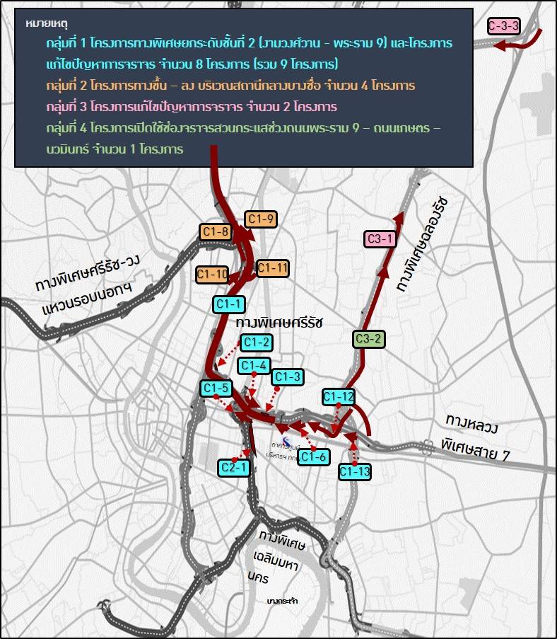 นายศักดิ์สยาม ได้กล่าวเพิ่มเติมว่า ปัจจุบัน กทพ. อยู่ระหว่างการศึกษาความเหมาะสมด้านวิศวกรรม เศรษฐกิจ การเงิน และสิ่งแวดล้อม ของโครงการการแก้ไขปัญหาการจราจรบนโครงข่ายทางพิเศษระยะที่ 1 จำนวน 16 โครงการ แบ่งเป็น 4 กลุ่ม ประกอบด้วย