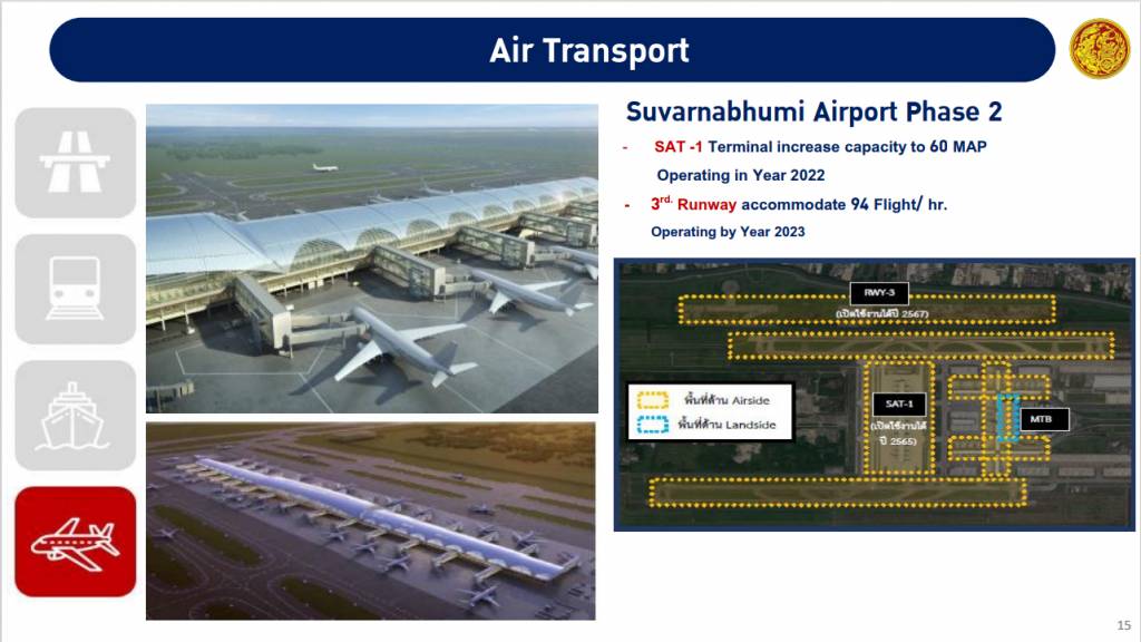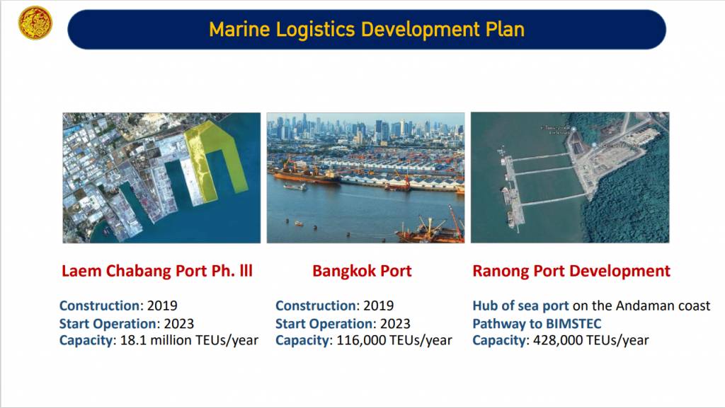 - การพัฒนาระบบขนส่งสาธารณะในเมืองหลัก การพัฒนารถไฟความเร็วสูง ช่วงกรุงเทพฯ – นครราชสีมา – หนองคาย รถไฟความเร็วสูงเชื่อม 3 สนามบิน (ดอนเมือง – สุวรรณภูมิ – อู่ตะเภา) โครงการพัฒนาท่าเรือแหลมฉบัง ระยะที่ 3 ในส่วนของท่าเรือ F โครงการพัฒนาท่าเรือกรุงเทพ ท่าเรือระนอง ระยะที่ 2 - การพัฒนาท่าอากาศยานสุวรรณภูมิ ระยะที่ 2 ท่าอากาศยานอู่ตะเภา