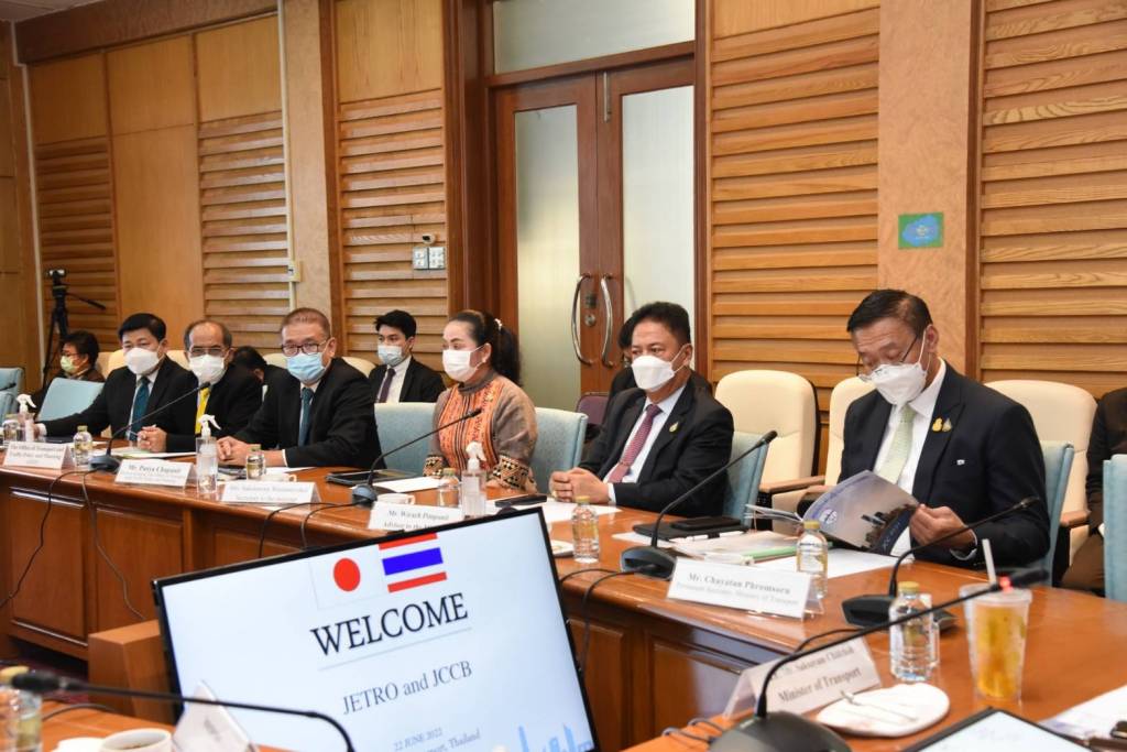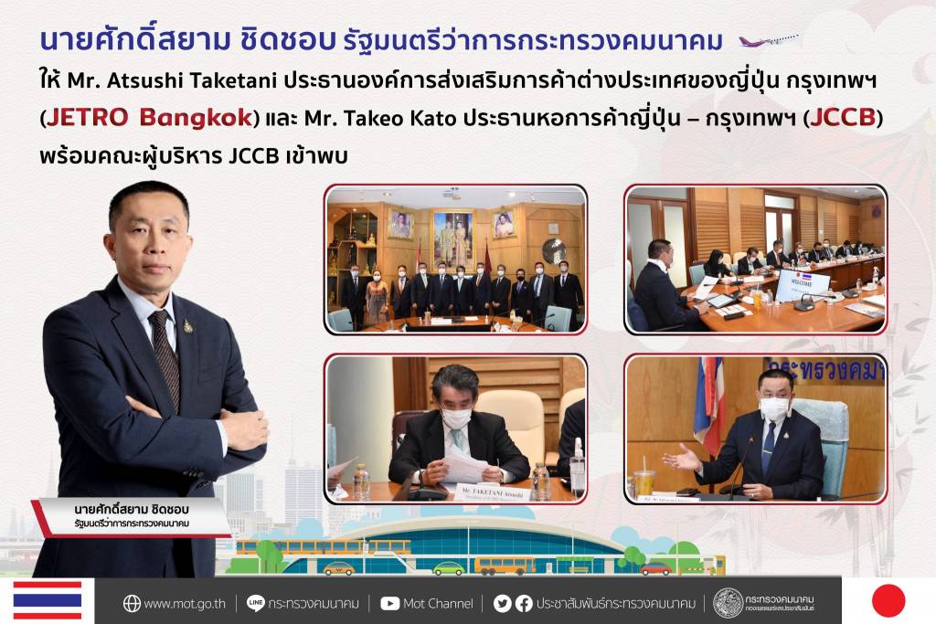 นายศักดิ์สยาม กล่าวว่า JETRO Bangkok และ JCCB ได้รายงานผลสำรวจความเห็นของเอกชนญี่ปุ่นที่ลงทุนในไทย พร้อมเสนอข้อคิดเห็นจากภาคเอกชนญี่ปุ่นที่ลงทุนในประเทศไทย มีประเด็นความสนใจของภาคเอกชน เช่น การพัฒนารถไฟฟ้าขนส่งมวลชนในพื้นที่กรุงเทพมหานคร และปริมณฑล และการพัฒนาโครงการต่าง ๆ ของ คค. โดย ได้นำเสนอการพัฒนาโครงสร้างพื้นฐานด้านคมนาคมของไทย
