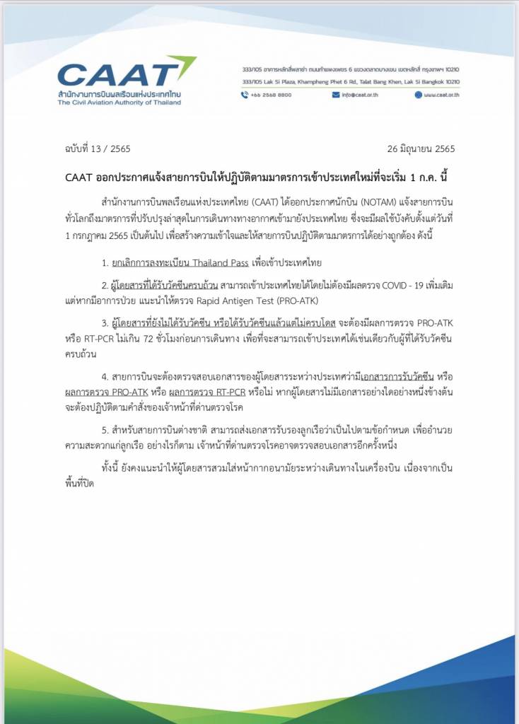นายศักดิ์สยาม ชิดชอบ รัฐมนตรีว่าการกระทรวงคมนาคม เปิดเผยว่า สำนักงานการบินพลเรือนแห่งประเทศไทย (CAAT) ได้ออกประกาศนักบิน (NOTAM) แจ้งสายการบินทั่วโลกถึงมาตรการที่ปรับปรุงล่าสุดในการเดินทางทางอากาศเข้ามายังประเทศไทย ซึ่งจะมีผลใช้บังคับตั้งแต่วันที่ 1 ก.ค. 2565 เป็นต้นไป เพื่อสร้างความเข้าใจ และให้สายการบินปฏิบัติตามมาตรการได้อย่างถูกต้อง