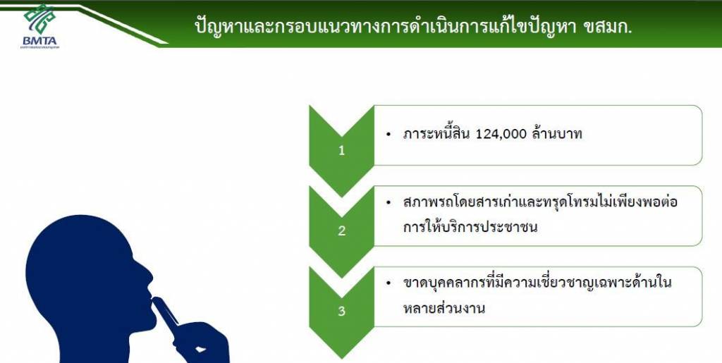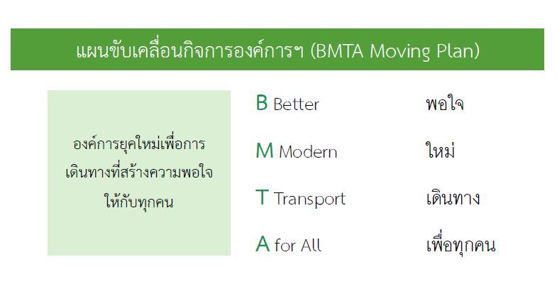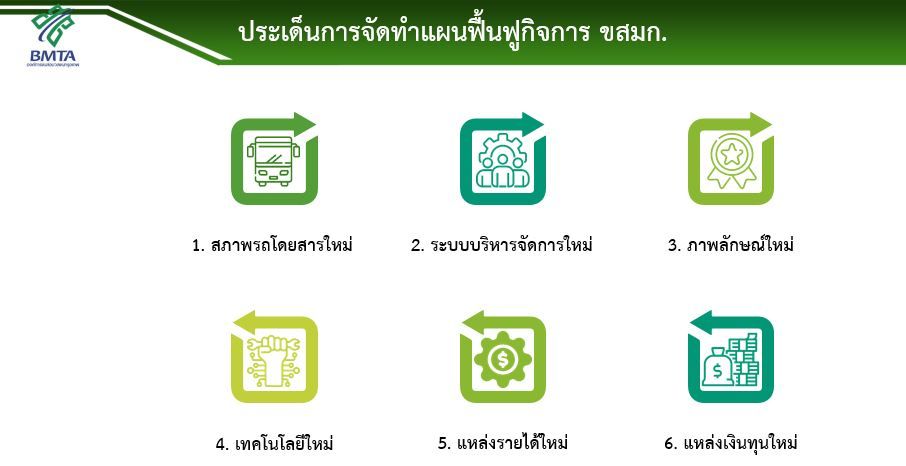 สภาพรถโดยสาร โดยการเพิ่มประสิทธิภาพการบริหารสัญญาซ่อมบำรุงรถโดยสาร การจัดหารถโดยสารที่มีขนาดเหมาะสมมาให้บริการ การปรับปรุงสภาพรถ (Refurbish) ให้พร้อมใช้บริการ และการเปลี่ยนรถโดยสาร (Conversion) เป็นรถพลังงานไฟฟ้า ระบบบริหารจัดการ โดยการบริหารต้นทุนการจัดเก็บค่าโดยสาร การปรับเส้นทางเดินรถให้มีความสอดคล้องกับแนวเส้นทางรถไฟฟ้า การรับสมัครพนักงานที่มีความหลากหลาย ทั้งรูปแบบพนักงานประจำและพนักงานสัญญา การปรับโครงสร้างองค์กรให้มีความกระชับ การจัดทำแผนดำเนินงานที่มีส่วนร่วมจากหลากหลายหน่วยงาน รวมทั้งการสร้างการยอมรับการเป็นองค์กรบริการสาธารณะที่มุ่งเน้นการให้บริการภาพลักษณ์ โดยการประชาสัมพันธ์ การเปิดให้ประชาชนแบ่งปันประสบการณ์ตรงจากการใช้บริการ รวมทั้งการสร้างความเข้าใจกับบุคคลากรในองค์การเพื่อเสริมสร้างเรื่องราวดีๆ ที่เกิดขึ้นภายในองค์การเทคโนโลยี โดยการมุ่งเน้นการใช้งานเทคโนโลยีอย่างเป็นรูปธรรม การพัฒนา Application ของ ขสมก. การสร้างฐานข้อมูลลูกค้าและผู้โดยสาร (Customer Persona) และการเร่งเพิ่มสัดส่วนการใช้งานบัตรโดยสารอิเล็กทรอนิกส์แหล่งรายได้อื่น โดยการปรับเปลี่ยนการจัดเก็บค่าโดยสารแบบเหมาจ่ายรายเดือน และเร่งรัดการเพิ่มรายได้จากการใช้ประโยชน์ที่ดินเชิงพาณิชย์ สำหรับพื้นที่ที่มีศักยภาพ เช่น อู่บางเขน อู่มีนบุรี เป็นต้น