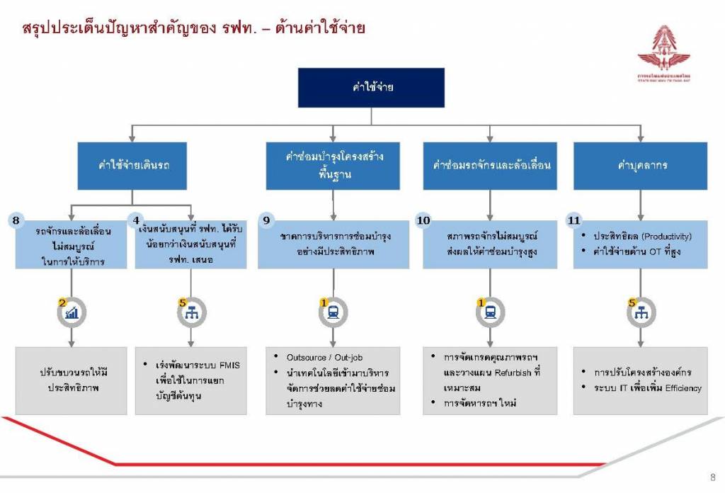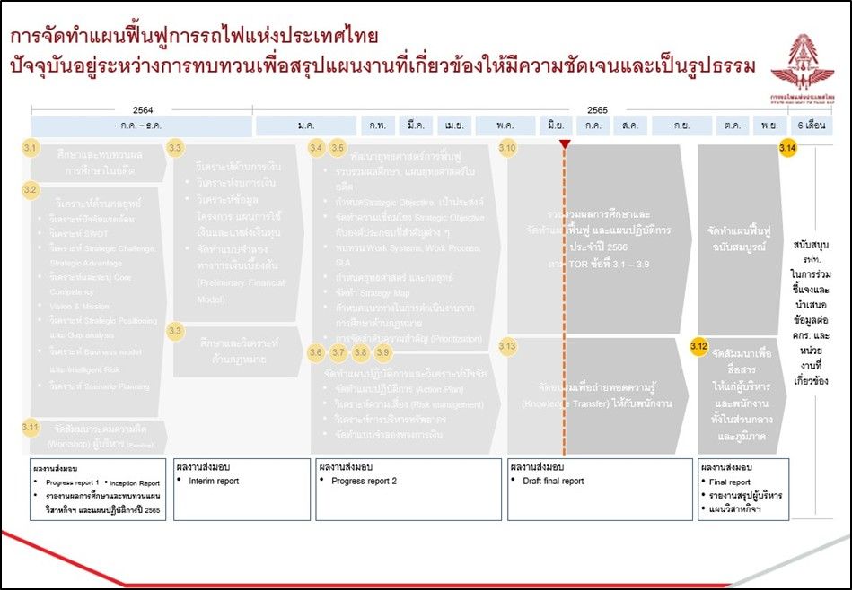 ซึ่งผู้แทนการรถไฟแห่งประเทศไทยได้รายงานความคืบหน้าการดำเนินการจัดทำแผนฟื้นฟูกิจการให้ที่ประชุมทราบ ดังนี้