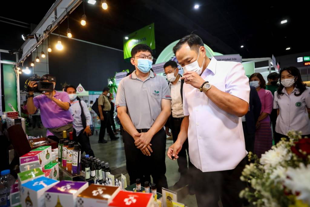จากนั้นนายอนุทิน เดินชมบูธผลิตภัณฑ์ยา เครื่องสำอาง อาหาร เครื่องดื่ม ที่มีส่วนผสมของสมุนไพรไทย หรือกัญชา ที่นำมาขายในงานเป็นจำนวนมาก