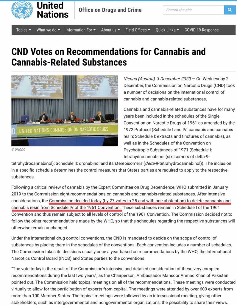 [5] Office on Drugs and Crime, United Nations, CND Votes on Recommendations for Cannabis and Cannabis-Related Substances. 3 December 2020