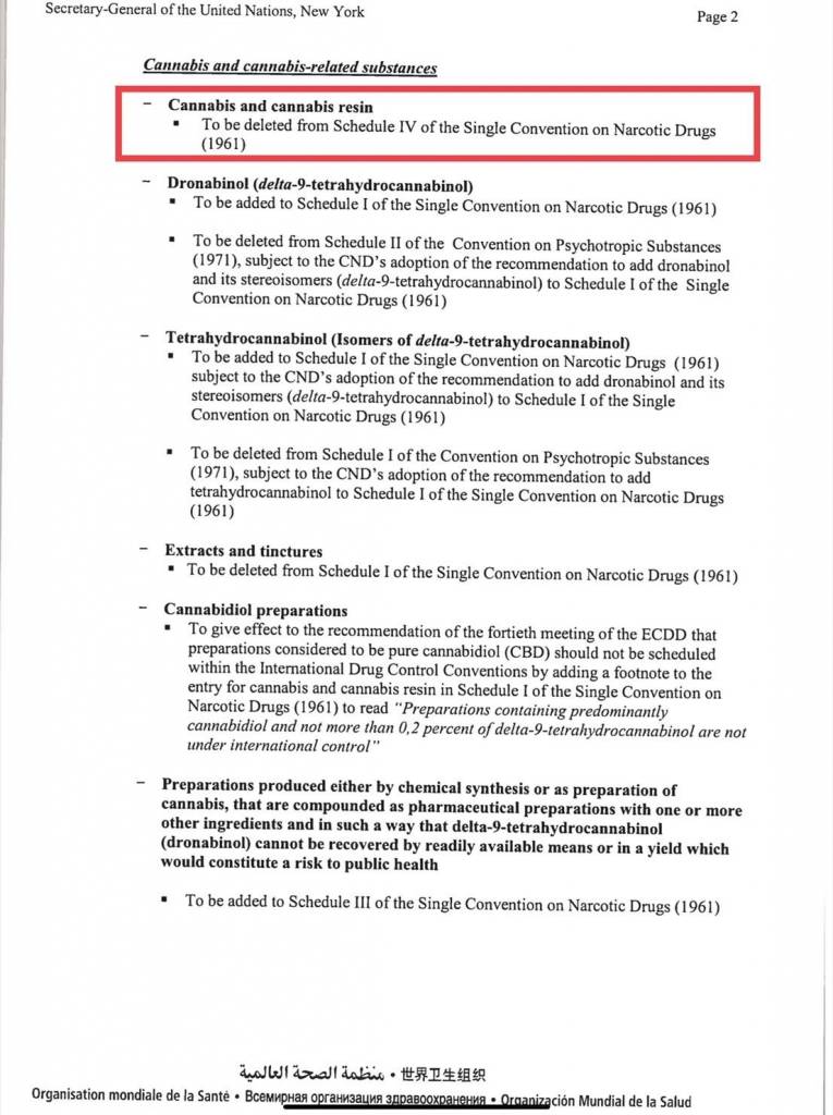 “ให้ช่อดอกกัญชาที่มียาง (Cannabis) และยางกัญชา(Resin) ลบออกจากบัญชียาเสพติดประเภทที่ 4 ของอนุสัญญาเดี่ยวว่าด้วยยาเสพติดให้โทษ ค.ศ. 1961” แต่ยังคงเอาไว้ในประเภทที่ 1 [5]