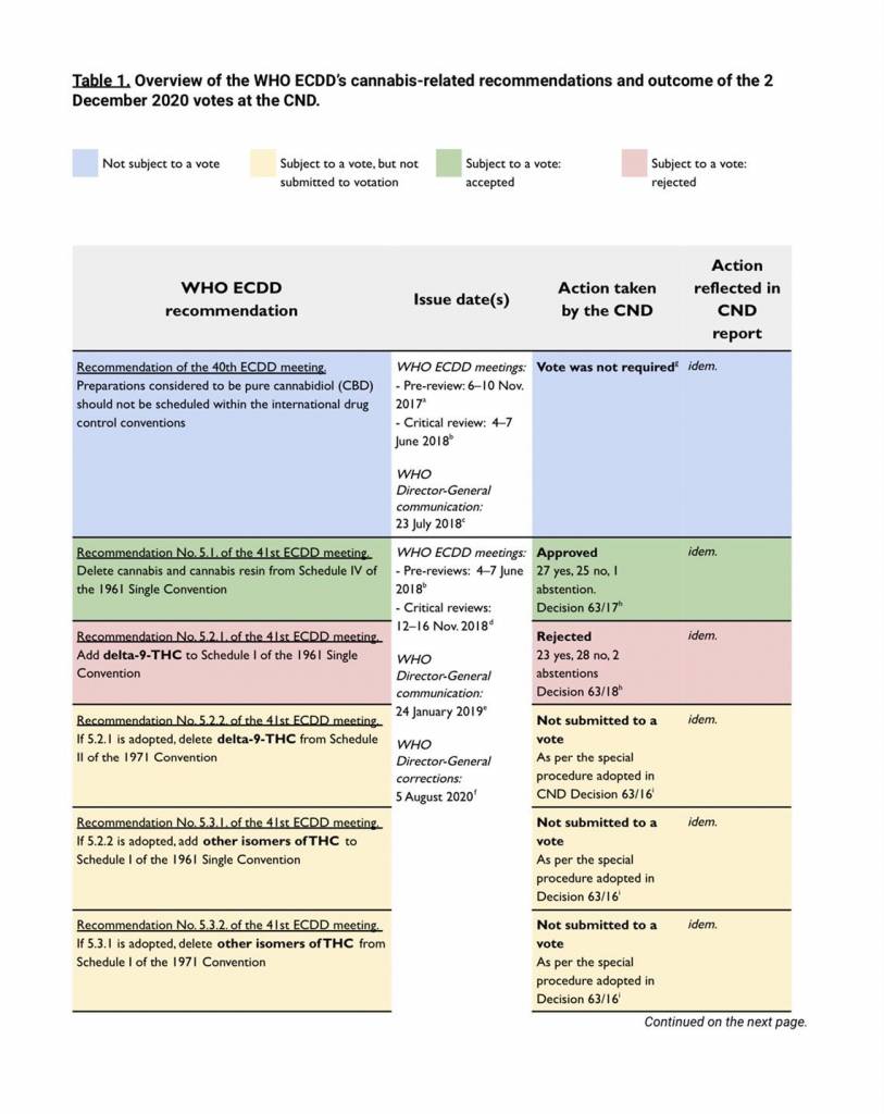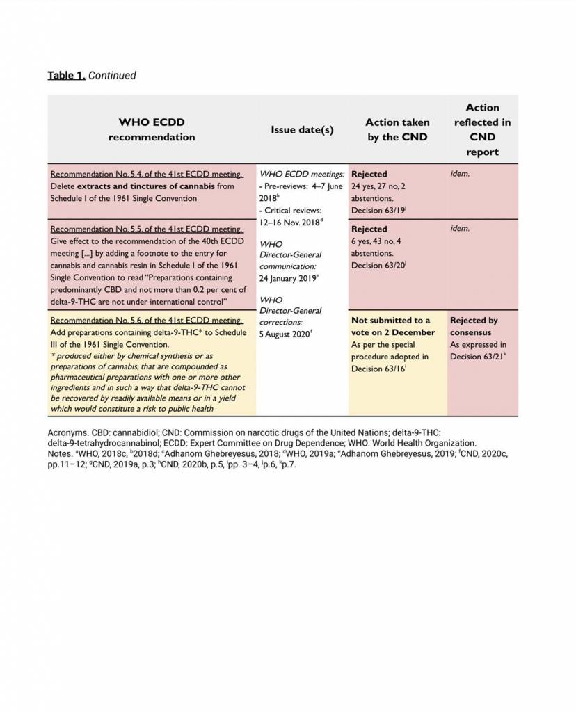 อย่างไรก็ตามข้อเสนออื่นๆ ที่องค์การอนามัยโลกเสนอต่อองค์การสหประชาชาติเมื่อวันที่ 24 มกราคม 2562 นั้น ที่ประชุมคณะกรรมการยาเสพติด องค์การสหประชาชาติ เมื่อวันที่ 2 ธันวาคม 2563 ลงมติไม่ผ่านความเห็นชอบด้วยเสียงข้างมาก หรือไม่เสนอลงมติทั้งสิ้น อันมีผลทำให้ “ช่อดอกกัญชา” และ “ยางจากช่อดอกกัญชา” เท่านั้นที่ไม่เป็นยาเสพติดประเภทที่ 4