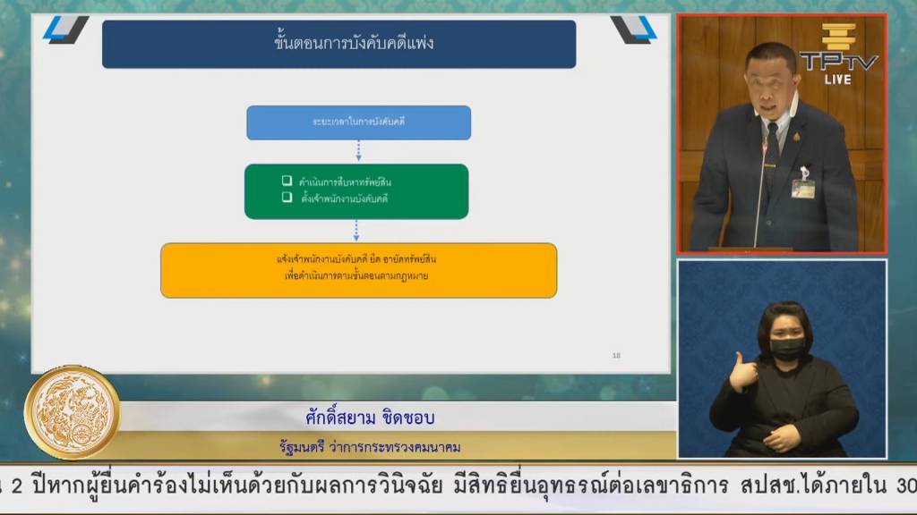 รมว.ศักดิ์สยาม กล่าวชี้แจงว่า ตามประมวลกฎหมายวิธีพิจารณาความแพ่ง มาตรา 145 คำพิพากษาหรือคำสั่งนั้นย่อมไม่ผูกพันบุคคลภายนอกเว้นแต่ในข้อต่อไปนี้ (2) คำพิพากษาที่วินิจฉัยถึงกรรมสิทธิ์แห่งทรัพย์สินใดๆ เป็นคุณแก่คู่ความฝ่ายใด ฝ่ายหนึ่งอาจใช้ยันแก่บุคคลภายนอกได้ เว้นแต่บุคคลภายนอกนั้นจะพิสูจน์ใด้ว่าตนมีสิทธิ์ดีกว่า ทั้งนี้ เมื่อข้อเท็จจริงปรากฏว่าที่ดินแปลงอื่นๆ ที่ยังไม่มีคำพิพากษาใดๆ อีกทั้งประชาชนในพื้นที่บริเวณเขากระโดงเป็นผู้ถือเอกสารสิทธิ์ที่ทางราชการออกให้ กฎหมายให้สันนิษฐานไว้ก่อนว่าผู้มีชื่อในโฉนดที่ดินเป็นผู้มีสิทธิ์ครอบครอง ในขณะนี้ผู้ถือเอกสารสิทธิ์ที่ยินยอมโต้แย้งได้ว่าเป็นผู้มีสิทธิ์ดีกว่าการรถไฟฯ ด้วยเหตุดังกล่าว การรถไฟฯ จึงได้ใช้สิทธิ์ในการฟ้องคดีต่อศาลปกครองกลางเพื่อพิสูจน์สิทธิดังกล่าว ซึ่งเป็นการดำเนินการตามกระบวนขั้นตอนของกฎหมาย