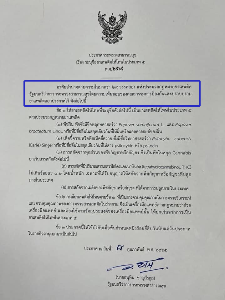 ซึ่งประกาศ เพื่อปลดล็อกกัญชานั้น คือ ประกาศกระทรวงสาธารณสุข เรื่องระบุชื่อยาเสพติดให้โทษประเภท 5 พ.ศ. 2565 ระบุว่า