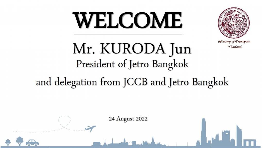 Mr. KURODA Jun (นายคุโรดะ จุน) ได้แนะนำตนเองในโอกาสเข้ารับตำแหน่งประธาน JETRO Bangkok คนใหม่ และรายงานผลการสำรวจแนวโน้มทางเศรษฐกิจของบริษัทร่วมทุนญี่ปุ่นในประเทศไทยในช่วงครึ่งแรกของปี 2565 (เดือนมกราคม - เดือนมิถุนายน) โดยผู้ประกอบการญี่ปุ่นคาดหวังว่าสถานการณ์การแพร่ระบาดของโรคโควิด-19 จะคลี่คลายไปในทิศทางที่ดียิ่งขึ้น และปัญหาการขาดแคลนวัตถุดิบและชิ้นส่วนจะได้รับการแก้ไข และได้นำเสนอข้อเรียกร้องต่อรัฐบาลไทย ซึ่งเอกชนญี่ปุ่นร้องขอมากที่สุดในเรื่อง “การส่งเสริมมาตรการกระตุ้นเศรษฐกิจ เช่น การพัฒนาโครงสร้างพื้นฐานเพื่อการสาธารณูปโภค” รวมทางญี่ปุ่นได้มีข้อเสนอแนะถึงการปรับปรุงการดำเนินการด้านโลจิสติกส์ของประเทศไทยเพื่อเพิ่มความน่าดึงดูดในด้านการค้าการลงทุนให้แก่ต่างประเทศ