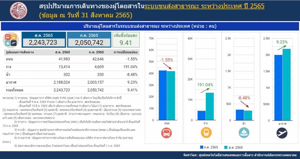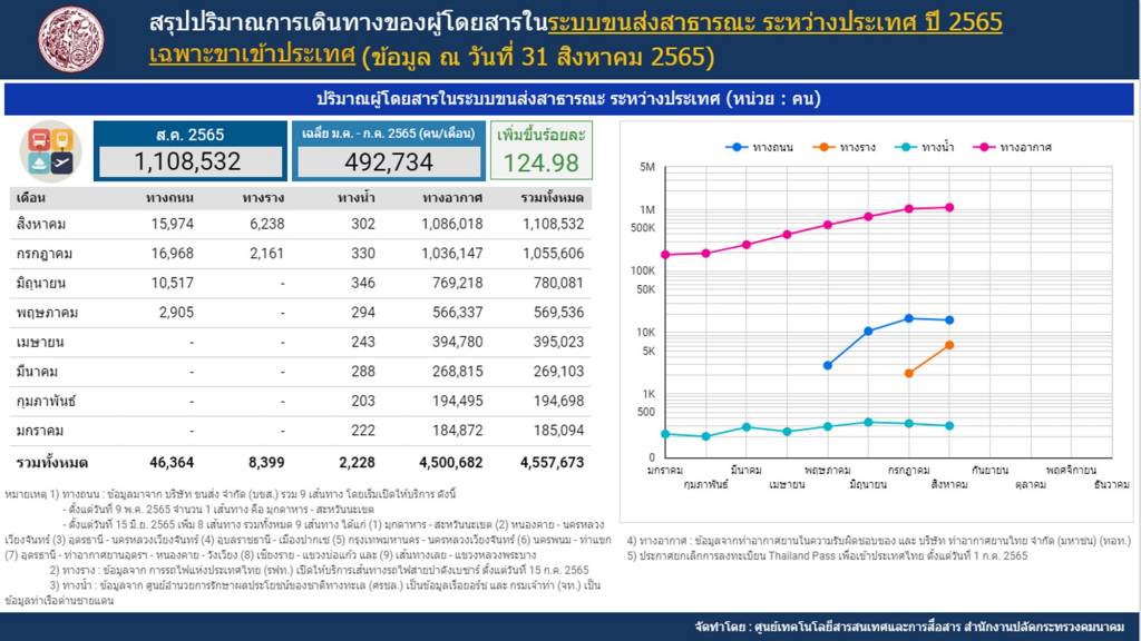 “คมนาคม” เผยปริมาณการเดินทางนักท่องเที่ยวระหว่างประเทศขาเข้า ส.ค. 65 เข้า-ออกไทย “บก-น้ำ-ราง-อากาศ” กว่า 2.24 ล้านคน พุ่งสูง 125% เมื่อเทียบกับ 7 เดือนที่ผ่านมา ชี้ “สุวรรณภูมิ” สุดฮอต! เดือนเดียวมีผู้โดยสารแตะ 1.6 ล้านคน