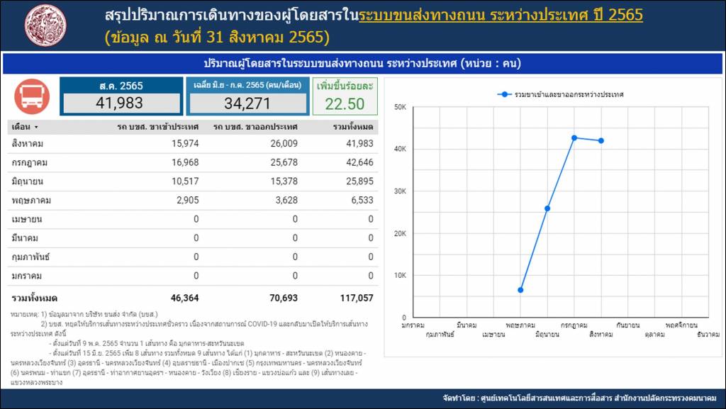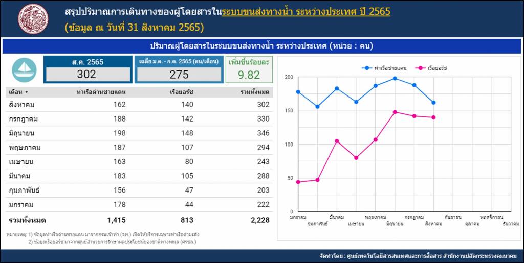 ขณะที่ ทางน้ำ มีปริมาณผู้โดยสารขาเข้าประเทศ ส.ค. 2565 รวม 302 คน เพิ่มขึ้นจากค่าเฉลี่ย ม.ค.-ก.ค. 2565 ซึ่งมีผู้โดยสารขาเข้าเฉลี่ยเดือนละ 275 คน คิดเป็นเพิ่มขึ้น 9.82% ทั้งนี้ เมื่อเปรียบเทียบกับ ก.ค. 2565 พบว่า มีผู้โดยสารลดลงเล็กน้อย ซึ่งมีจํานวน 42,646 คน โดยลดลง 28 คน คิดเป็นลดลง 8.48%
