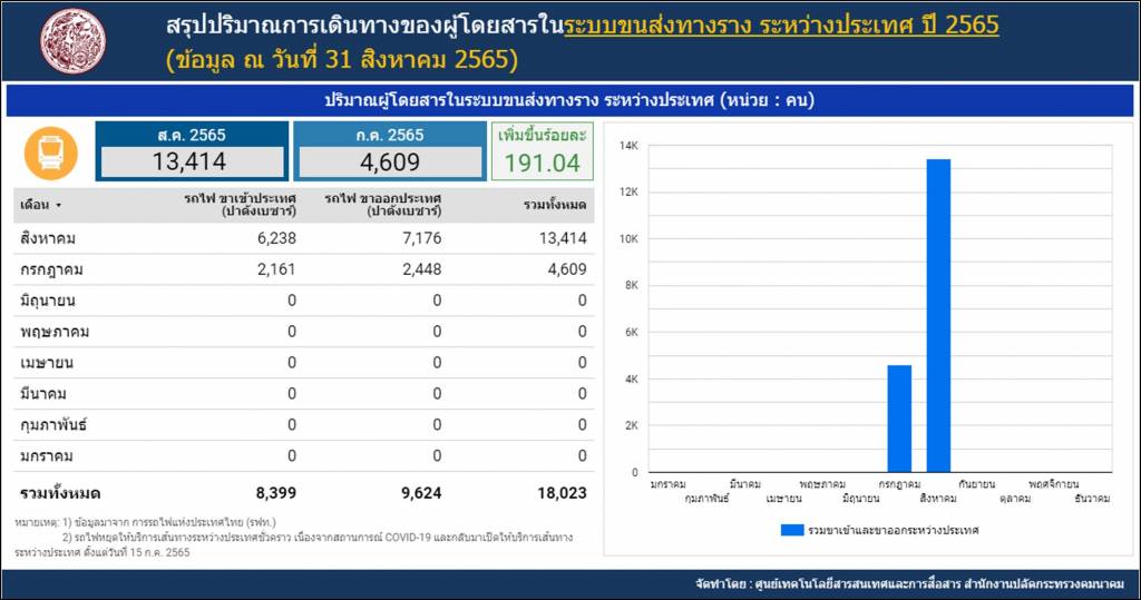 นายศักดิ์สยาม กล่าวอีกว่า ส่วนทางราง มีปริมาณผู้โดยสาร ส.ค. 2565 รวม 13,414 คน เพิ่มขึ้นจาก ก.ค. 2565 หรือเพิ่มขึ้น 191.04% เมื่อพิจารณาสัดส่วนการเดินทางขาเข้าและขาออกประเทศ พบว่า มีปริมาณการเดินทางขาเข้า 6,238 คน คิดเป็น 47% และมีปริมาณการเดินทางขาออก 7,176 คน คิดเป็น 53% หรือสัดส่วนการเดินทางขาเข้าและขาออก