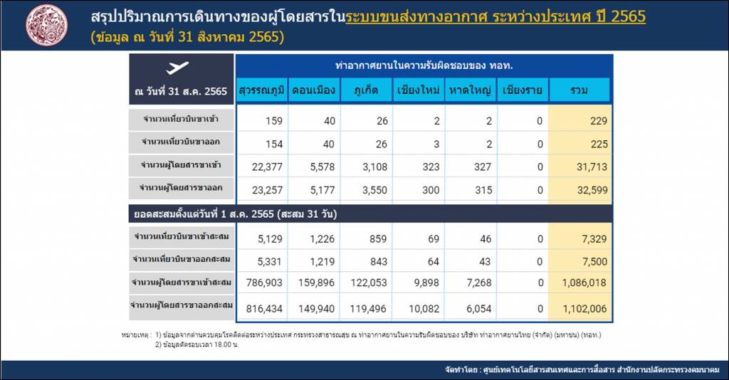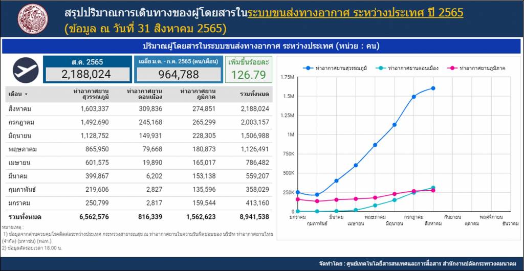 ทั้งนี้ เมื่อพิจารณาสัดส่วนการเดินทางรายท่าอากาศยาน ส.ค. 2565 พบว่า มีปริมาณการเดินทางผ่านท่าอากาศยานสุวรรณภูมิ 1,603,337 คน คิดเป็น 73% มีปริมาณการเดินทางผ่านท่าอากาศยานดอนเมือง 309,836 คน คิดเป็น 14% และมีปริมาณการเดินทางผ่านท่าอากาศยานภูมิภาค 274,851 คน คิดเป็น 13%