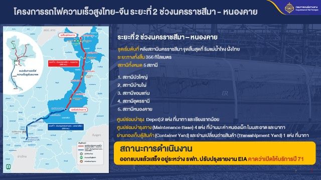 - โครงการรถไฟความเร็วสูงระยะที่ 2 ช่วงนครราชสีมา - หนองคาย อยู่ระหว่างปรับปรุงรายงาน EIA คาดว่าเปิดให้บริการปี 2571