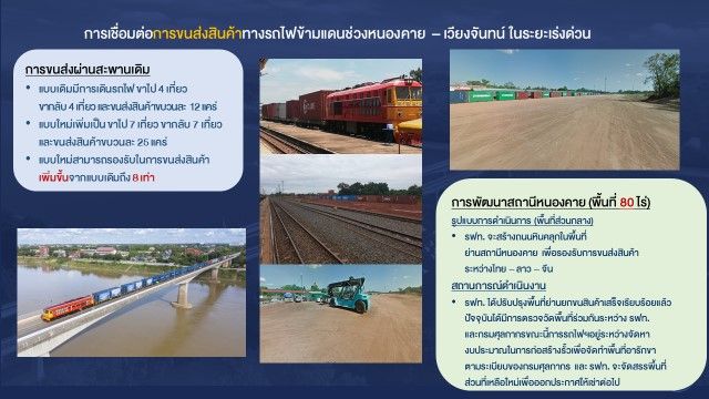 - ระยะเร่งด่วน : การพัฒนาย่านสถานีหนองคายเป็นพื้นที่เปลี่ยนถ่ายสินค้า การเตรียมความพร้อมในการเปิดเส้นทางรถไฟจีน - ลาว โดยมีการพัฒนาสถานีหนองคายให้รองรับการขนส่งผ่านสะพานเดิม โดยเพิ่มรถไฟ จาก 4 ขบวนต่อวัน เป็น 14 ขบวนต่อวัน และเพิ่มจากขบวนละ 12 แคร่ เป็น 25 แคร่ โดยพัฒนาบริเวณสถานีที่มีพื้นที่ประมาณ 80 ไร่ ให้เป็นพื้นที่ตรวจปล่อยสินค้าระหว่างประเทศ และการเปลี่ยนถ่ายจากถนนสู่ราง โดย รฟท. ได้ปรับปรุงพื้นที่บริเวณลานยกขนสินค้าเรียบร้อยแล้ว ทั้งนี้ กรมศุลกากรดำเนินการขอออกประกาศ
