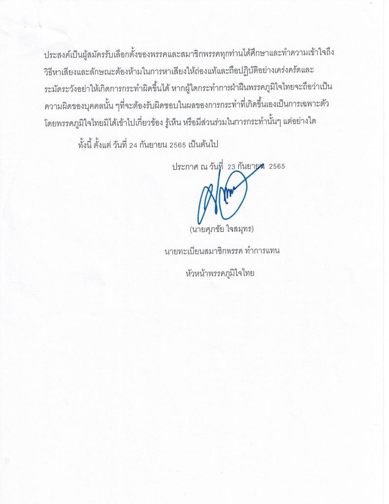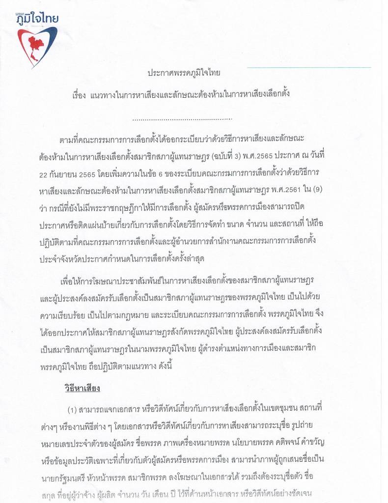 11 ตุลาคม 2565 เวลา 09:38ประกาศพรรคภูมิใจไทย เรื่อง แนวทางในการหาเสียงและลักษณะต้องห้ามในการหาเสียงเลือกตั้งประกาศพรรคภูมิใจไทย เรื่อง แนวทางในการหาเสียงและลักษณะต้องห้ามในการหาเสียงเลือกตั้ง ตามที่คณะกรรมการการเลือกตั้งได้ออกระเบียบว่าด้วยวิธีการหาเสียงและลักษณะ ต้องห้ามในการหาเสียงเลือกตั้งสมาชิกสภาผู้แทนราษฎร (ฉบับที่ 3) พ.ศ.2555 ประกาศ ณ วันที่ 22 กันยายน 2565 โดยเพิ่มความในข้อ 6 ของระเบียบคณะกรรมการการเลือกตั้งว่าด้วยวิธีการ หาเสียงและลักษณะต้องห้ามในการหาเสียงเลือกตั้งสมาชิกสภาผู้แทนราษฎร พ.ศ.2561 ใน (9) ว่า กรณีที่ยังไม่มีพระราชกฤษฎีกาให้มีการเลือกตั้ง ผู้สมัครหรือพรรคการเมืองสามารถปิด ประกาศหรือติดแผ่นป้ายเกี่ยวกับการเลือกตั้งโดยวิธีการจัดทํา ขนาด จํานวน และสถานที่ ให้ถือ ปฏิบัติตามที่คณะกรรมการการเลือกตั้งและผู้อํานวยการสํานักงานคณะกรรมการการเลือกตั้ง ประจําจังหวัดประกาศกําหนดในการเลือกตั้งครั้งล่าสุด เพื่อให้การโฆษณาประชาสัมพันธ์ในการหาเสียงเลือกตั้งของสมาชิกสภาผู้แทนราษฎร และผู้ประสงค์ลงสมัครรับเลือกตั้งเป็นสมาชิกสภาผู้แทนราษฎรของพรรคภูมิใจไทย เป็นไปด้วย ความเรียบร้อย เป็นไปตามกฎหมาย และระเบียบคณะกรรมการการเลือกตั้ง พรรคภูมิใจไทย จึง ได้ออกประกาศให้สมาชิกสภาผู้แทนราษฎรสังกัดพรรคภูมิใจไทย ผู้ประสงค์ลงสมัครรับเลือกตั้ง เป็นสมาชิกสภาผู้แทนราษฎรในนามพรรคภูมิใจไทย ผู้ดํารงตําแหน่งทางการเมืองและสมาชิก พรรคภูมิใจไทย ถือปฏิบัติตามแนวทาง ดังนี้ วิธีหาเสียง (1) สามารถแจกเอกสาร หรือวิดีทัศน์เกี่ยวกับการหาเสียงเลือกตั้งในเขตชุมชน สถานที่ ต่างๆ หรืองานพิธีต่าง ๆ โดยเอกสารหรือวิดีทัศน์เกี่ยวกับการหาเสียงสามารถระบุชื่อ รูปถ่าย หมายเลขประจําตัวของผู้สมัคร ชื่อพรรค ภาพเครื่องหมายพรรค นโยบายพรรค คติพจน์ คําขวัญ หรือข้อมูลประวัติเฉพาะที่เกี่ยวกับตัวผู้สมัครหรือพรรคการเมือง สามารนําภาพผู้ถูกเสนอชื่อเป็น นายกรัฐมนตรี หัวหน้าพรรค สมาชิกพรรค ลงโฆษณาในเอกสารได้ รวมถึงต้องระบุชื่อตัว ชื่อ สกุล ที่อยู่ผู้ว่าจ้าง ผู้ผลิต จํานวน วัน เดือน ปี ไว้ที่ด้านหน้าเอกสาร หรือวิดีทัศน์อย่างชัดเจน (2) สามารถใช้พาหนะต่าง ๆ หรือจัดเวที หรือสถานที่เพื่อการโฆษณาหาเสียงเลือกตั้ง โดยให้ผู้สมัครและพรรคการเมืองแจ้งรายละเอียดให้ผู้อํานวยการสํานักงานคณะกรรมการการ เลือกตั้งประจําจังหวัด ภายใน 10 วันหลังจากการปิดรับสมัครตามแบบที่ กกต.กําหนด และ พาหนะดังกล่าวไม่มีข้อห้ามเรื่องจํานวนพาหนะที่ใช้ สามาร