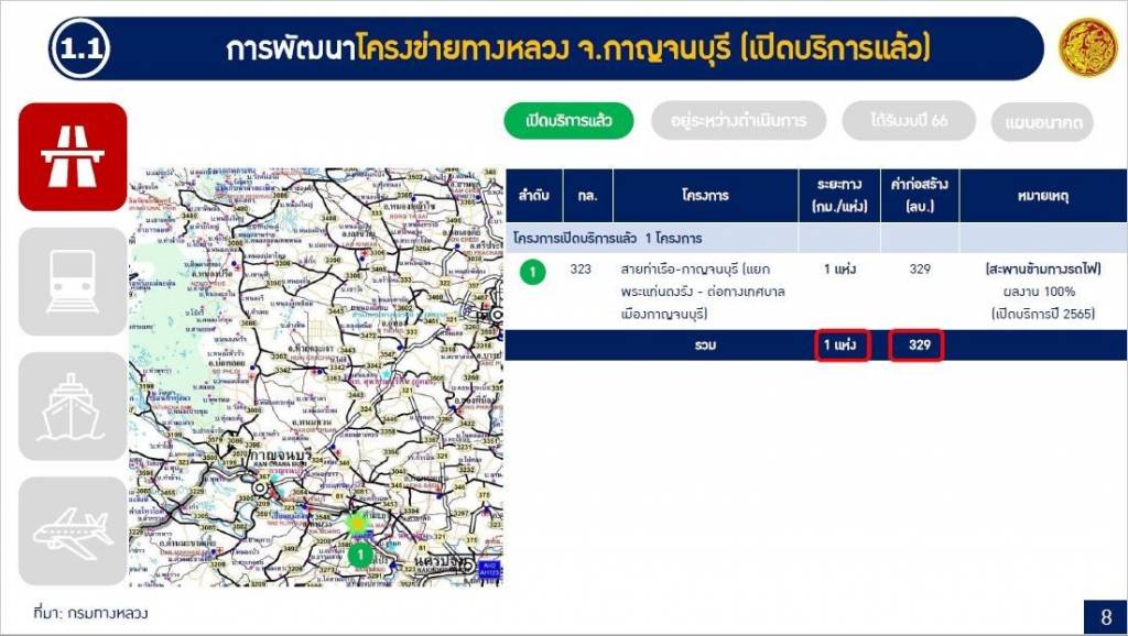 - โครงการก่อสร้างทางหลวงหมายเลข 323 สายท่าเรือ - กาญจนบุรี ดำเนินการแล้วเสร็จ