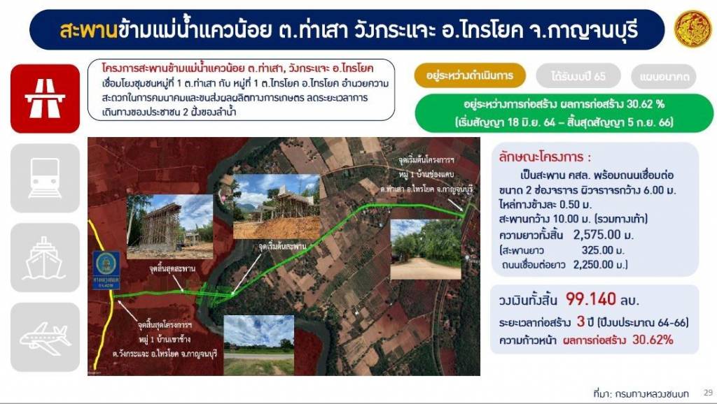 -โครงการสะพานข้ามแม่น้ำแควน้อย ตำบลท่าเสา และตำบลวังกระแจะ อำเภอไทรโยค อยู่ระหว่างดำเนินการก่อสร้าง ผลการก่อสร้าง 30.62%