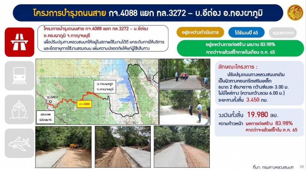 - โครงการบำรุงถนนสาย กจ.4088 แยก ทล.3272 - บ.อีต่อง อำเภอทองผาภูมิ อยู่ระหว่างดำเนินการก่อสร้าง ผลการก่อสร้าง 83.98% คาดว่าจะแล้วเสร็จในเดือนตุลาคม 2565