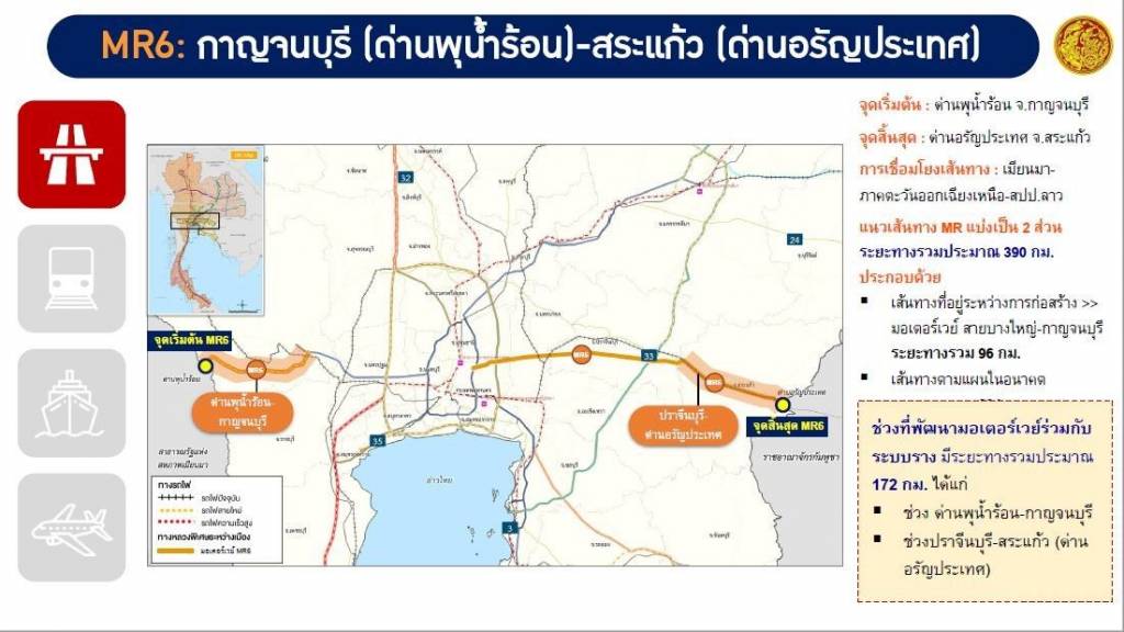 1.3 แผนแม่บทการพัฒนาโครงข่ายเชื่อมโยงระหว่างภูมิภาค MR-MAP เป็นโครงข่ายคมนาคมที่ประกอบไปด้วยถนนมอเตอร์เวย์และทางรถไฟพัฒนาอยู่ในพื้นที่บริเวณเดียวกัน เพื่อเชื่อมโยงการเดินทางกับภาคอื่นของประเทศไทยให้สามารถเดินทางได้อย่างสะดวกและปลอดภัย ส่งเสริมการขนส่งสินค้าอย่างมีประสิทธิภาพ ลดค่าใช้จ่ายในการขนส่ง โดยแผนการดำเนินการ ได้แก่ ปี 2564 แผนแม่บทโครงข่าย MR-MAP ได้ศึกษาแล้วเสร็จ และคณะกรรมการจัดการจราจรทางบก (คจร.) ได้เห็นชอบแล้ว ปี 2565 หน่วยงานที่รับผิดชอบ ได้แก่ กรมทางหลวง (ทล.) และการรถไฟแห่งประเทศไทย (รฟท.) จะดำเนินการสำรวจและออกแบบในรายโครงการ โดยมีเส้นทางที่ผ่านพื้นที่จังหวัดกาญจนบุรี ได้แก่ MR5 : กาญจนบุรี (ด่านเจดีย์สามองค์) - อุบลราชธานี (สะพานมิตรภาพไทย - ลาว แห่งที่ 6) ระยะทาง 832 กิโลเมตร ซึ่งเป็น 1 ใน 3 โครงการนำร่อง และ MR6 : กาญจนบุรี (ด่านพุน้ำร้อน) - สระแก้ว (ด่านอรัญประเทศ) ระยะทาง 390 กิโลเมตร